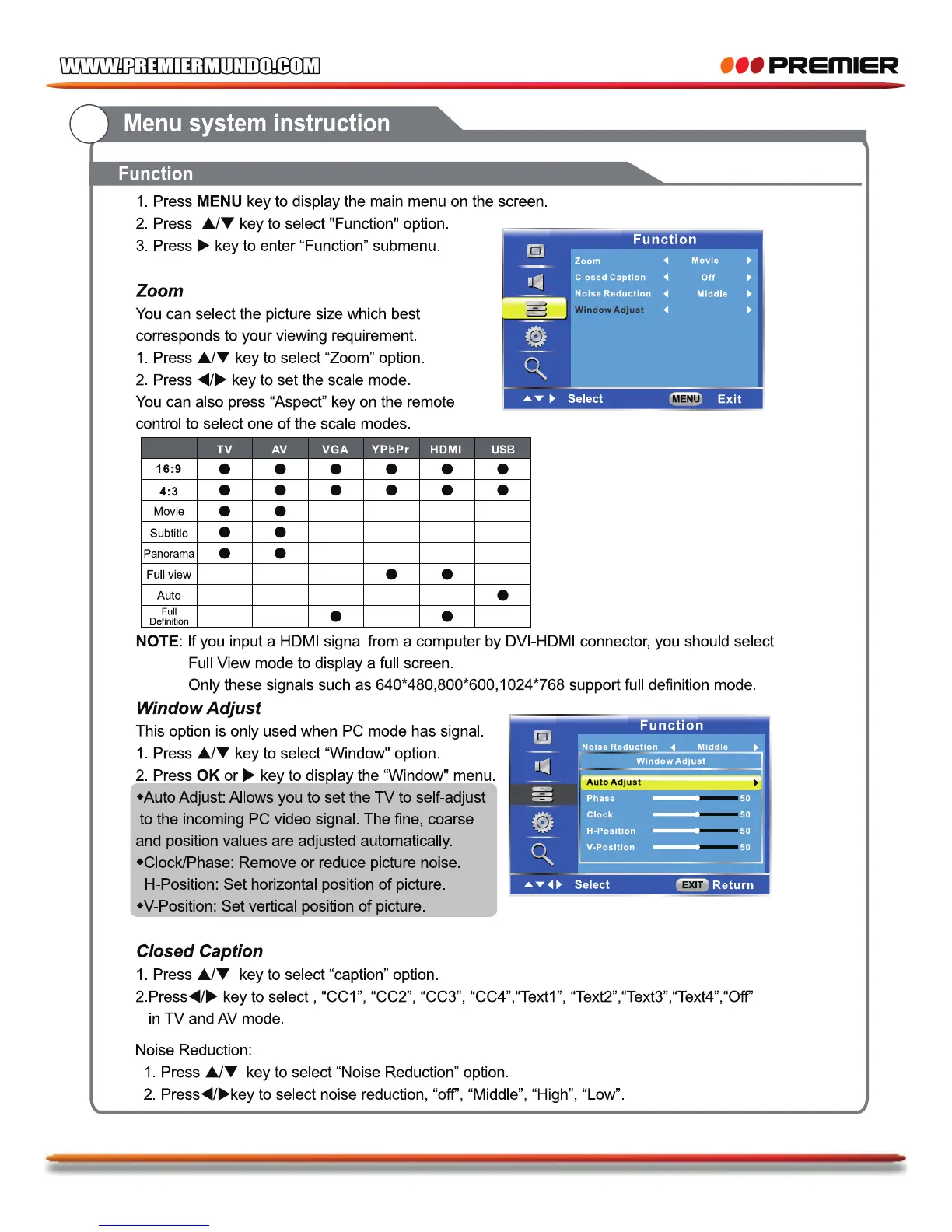 Premier TV-4802LED - Function Settings Menu; Picture Zoom and Aspect Ratio; Window Adjustment (PC Mode); Subtitle (Closed Caption) Settings