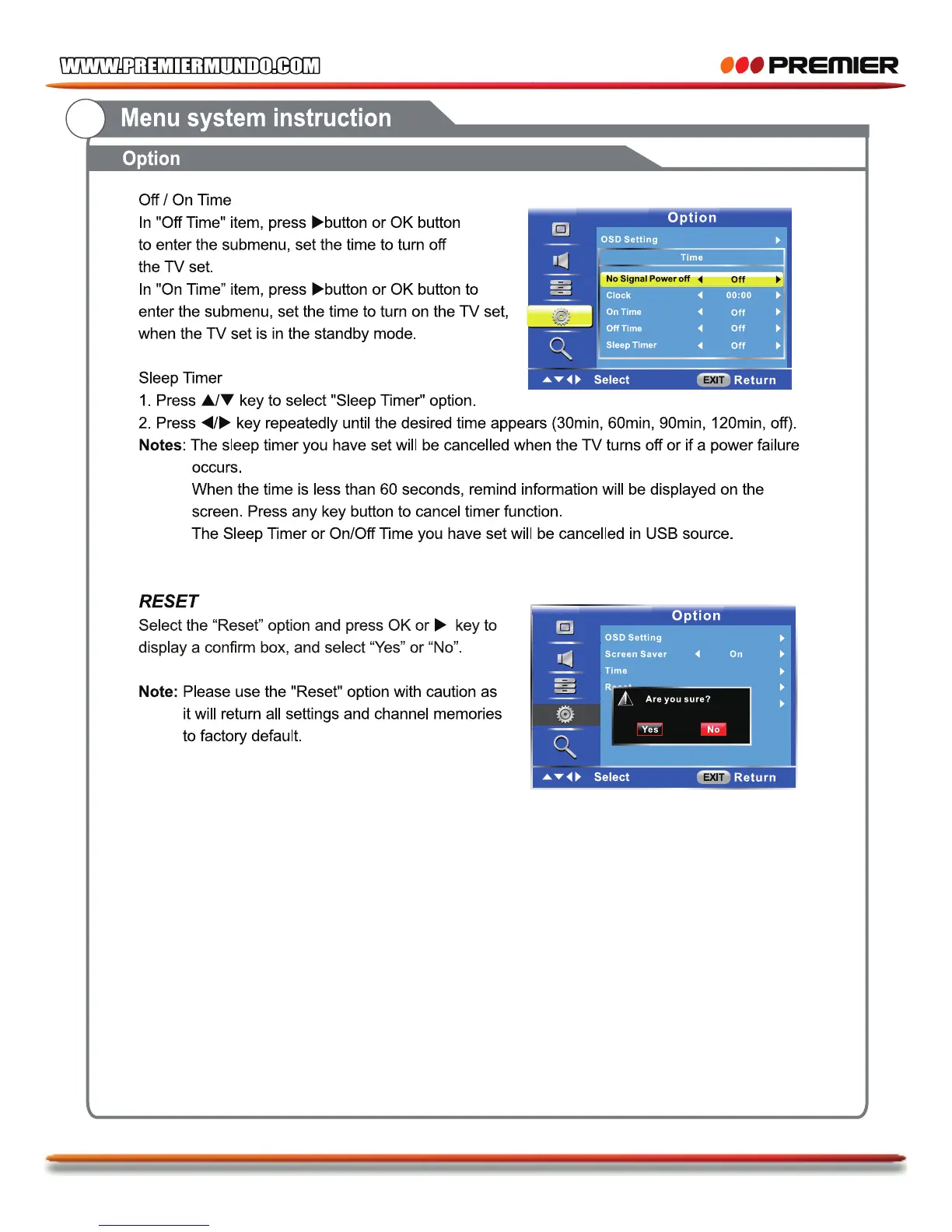 Premier TV-4802LED - On;Off Time and Sleep Timer; Factory Reset Procedure