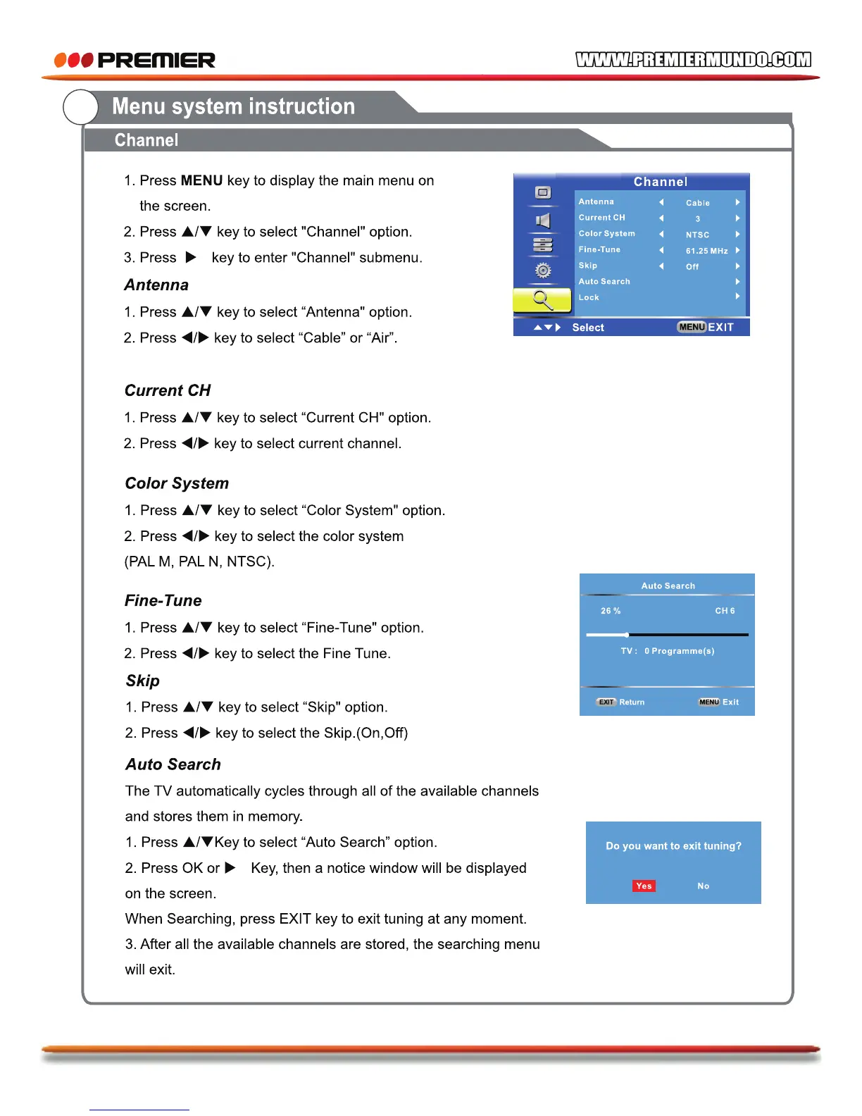 Premier TV-4802LED - Menu System: Channel Settings; Channel Setup and Tuning; Antenna Type Selection; Current Channel Display