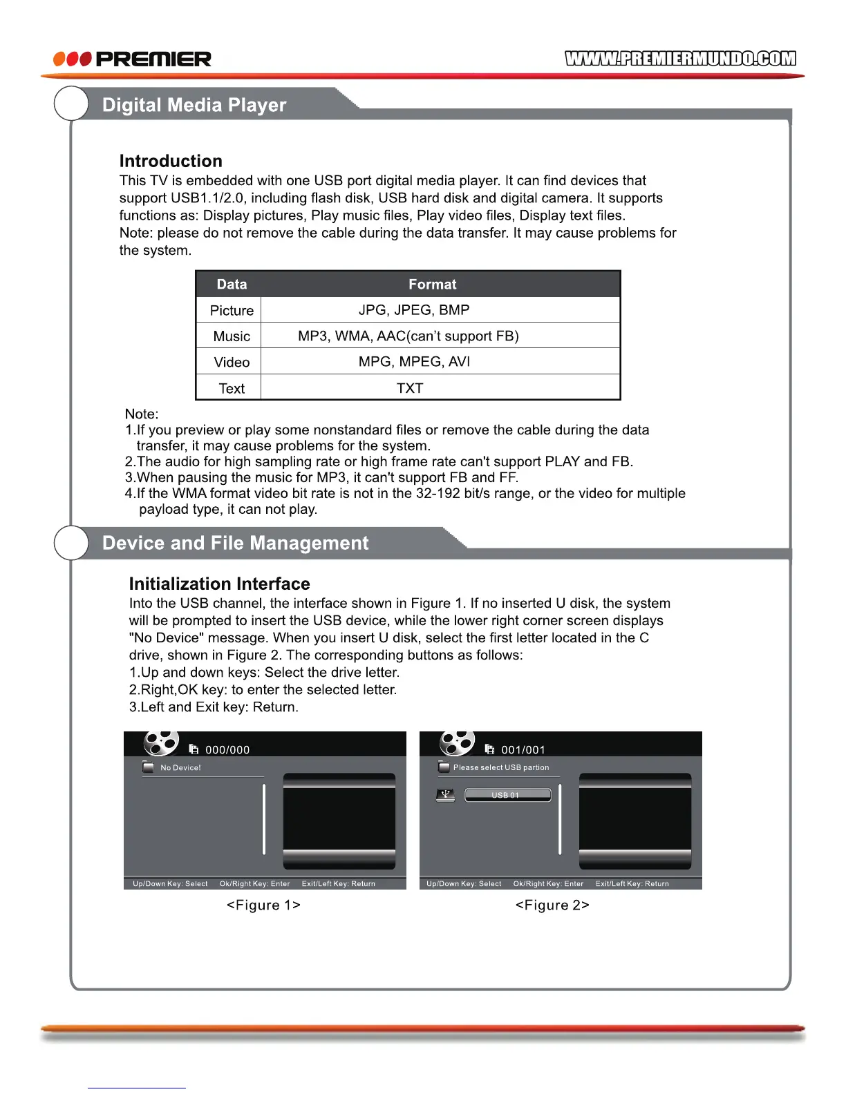 Premier TV-4802LED - Digital Media Player Functionality; Media Player Introduction; Media Player Usage Notes; Device and File Management