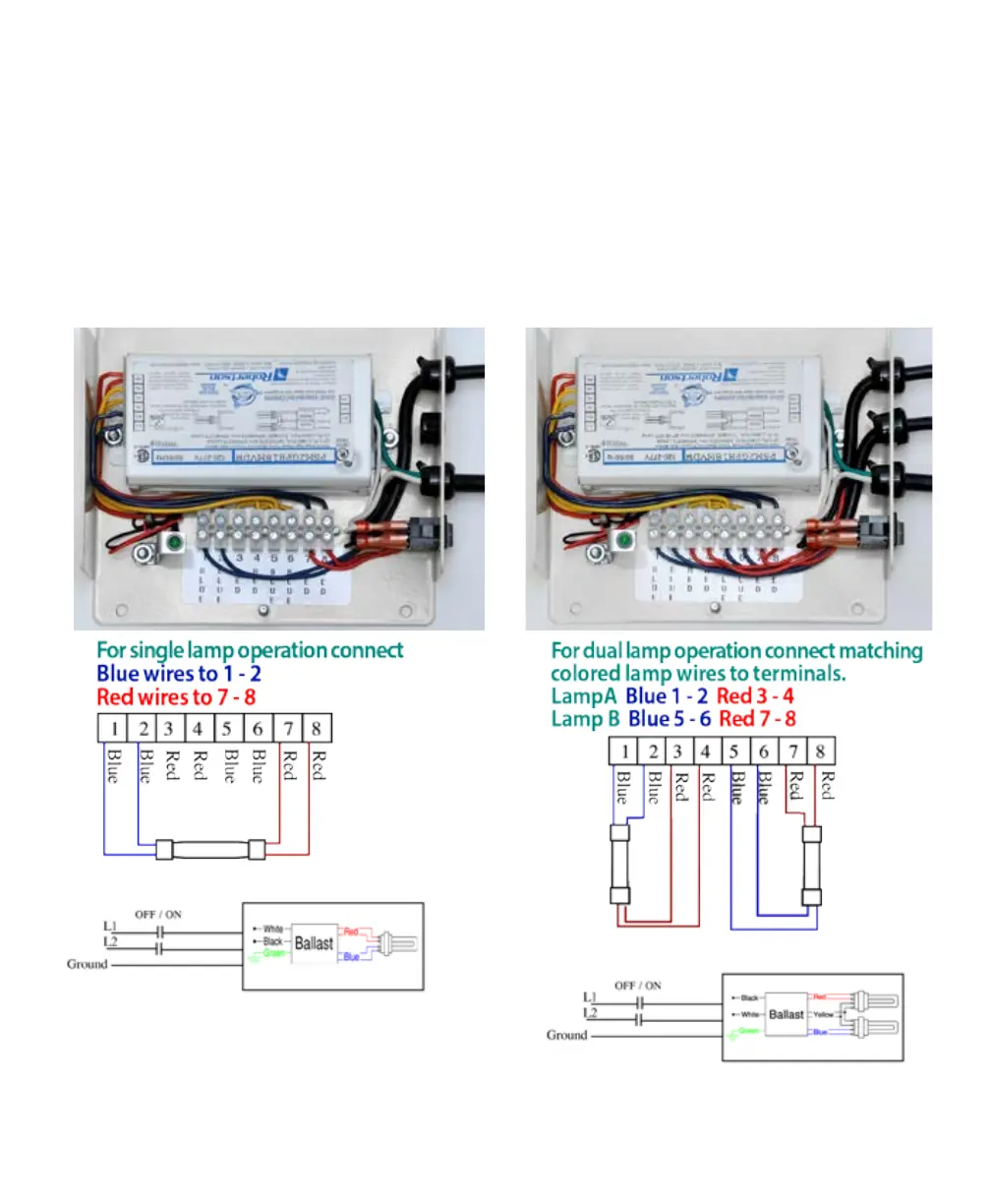 CORRECT WIRING FOR SINGLE LAMP OPERATION. CORRECT WIRING FOR DUAL LAMP OPERATION.