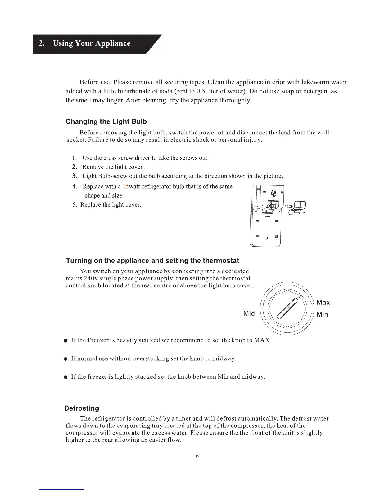 Premium PRN438HW - 2. Using Your Appliance; Changing the Light Bulb; Turning on the Appliance and Setting the Thermostat; Defrosting