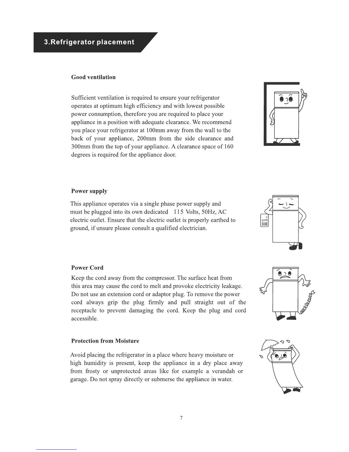 Premium PRN438HW - 3. Refrigerator Placement; Good Ventilation; Power Supply; Power Cord