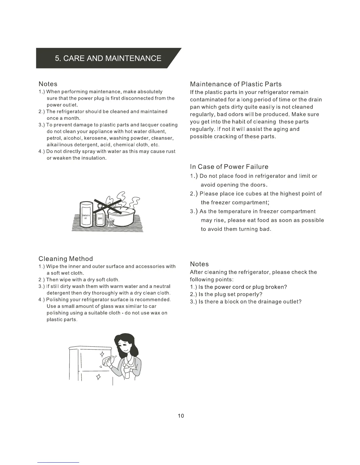 Premium PRN438HW - 5. Care and Maintenance; Cleaning Method; Maintenance of Plastic Parts; In Case of Power Failure