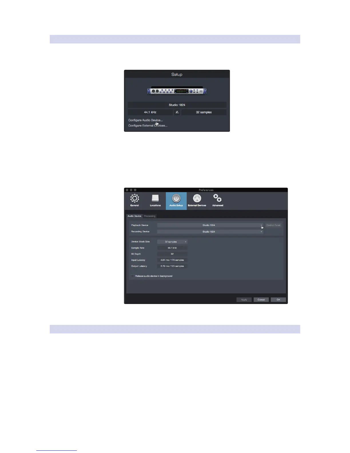 One, click on the Configure Audio Devices link in the Setup area to open the