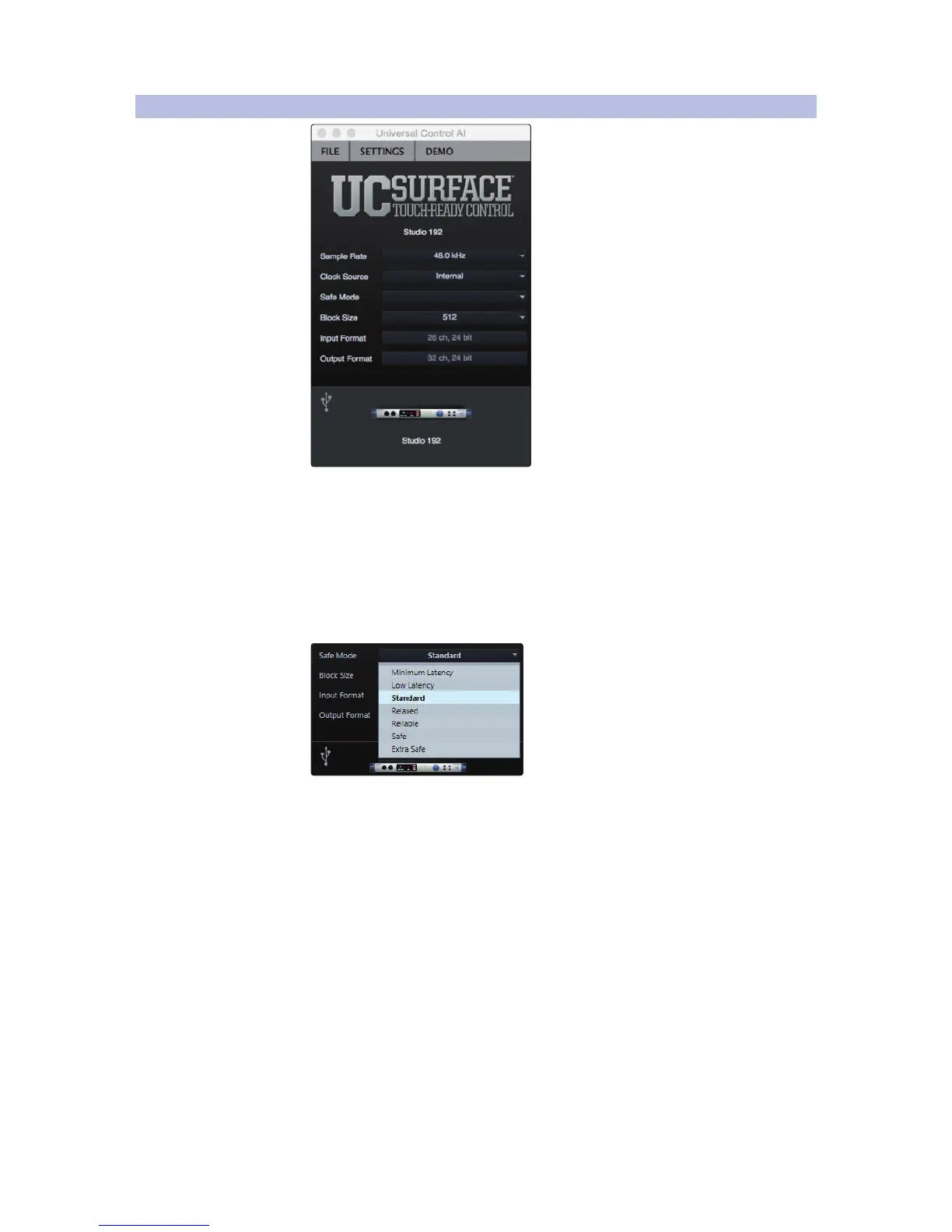From this menu, you can set the buffer size from 32 to 4,096 samples (Mac), or 64