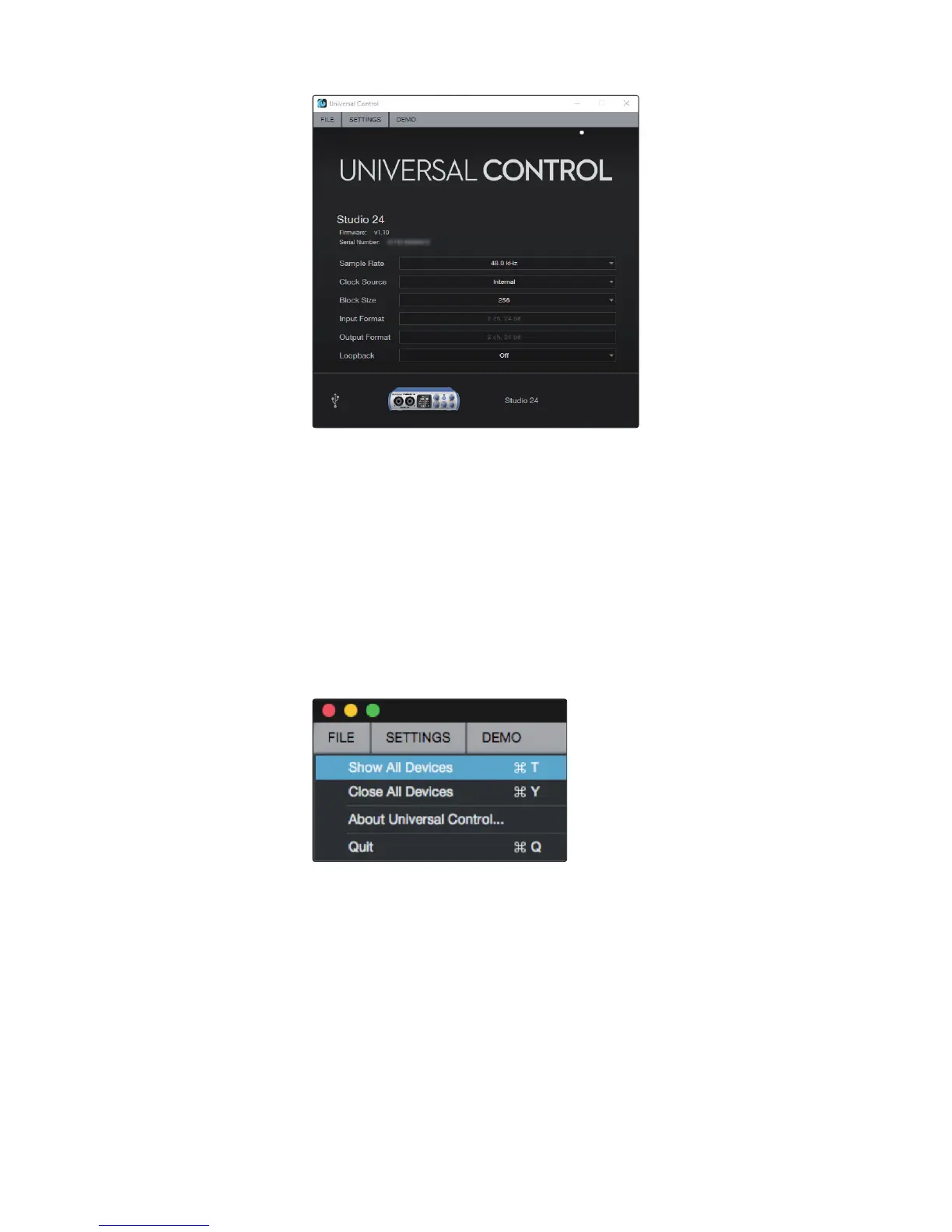 • Quit. Quits the Universal Control application and all hardware control windows.