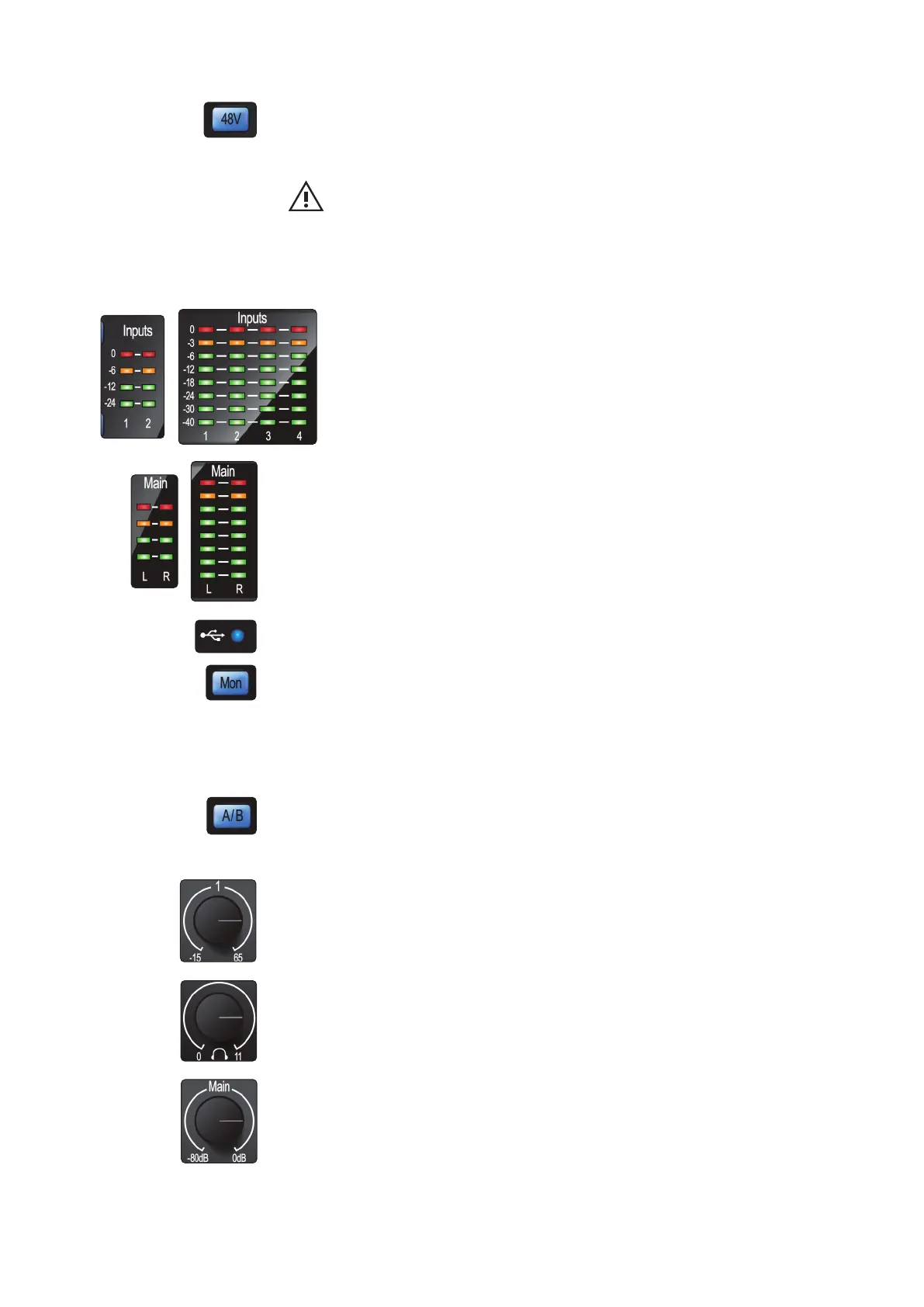 the microphone inputs. Pressing the 48V button switches phantom power on and off