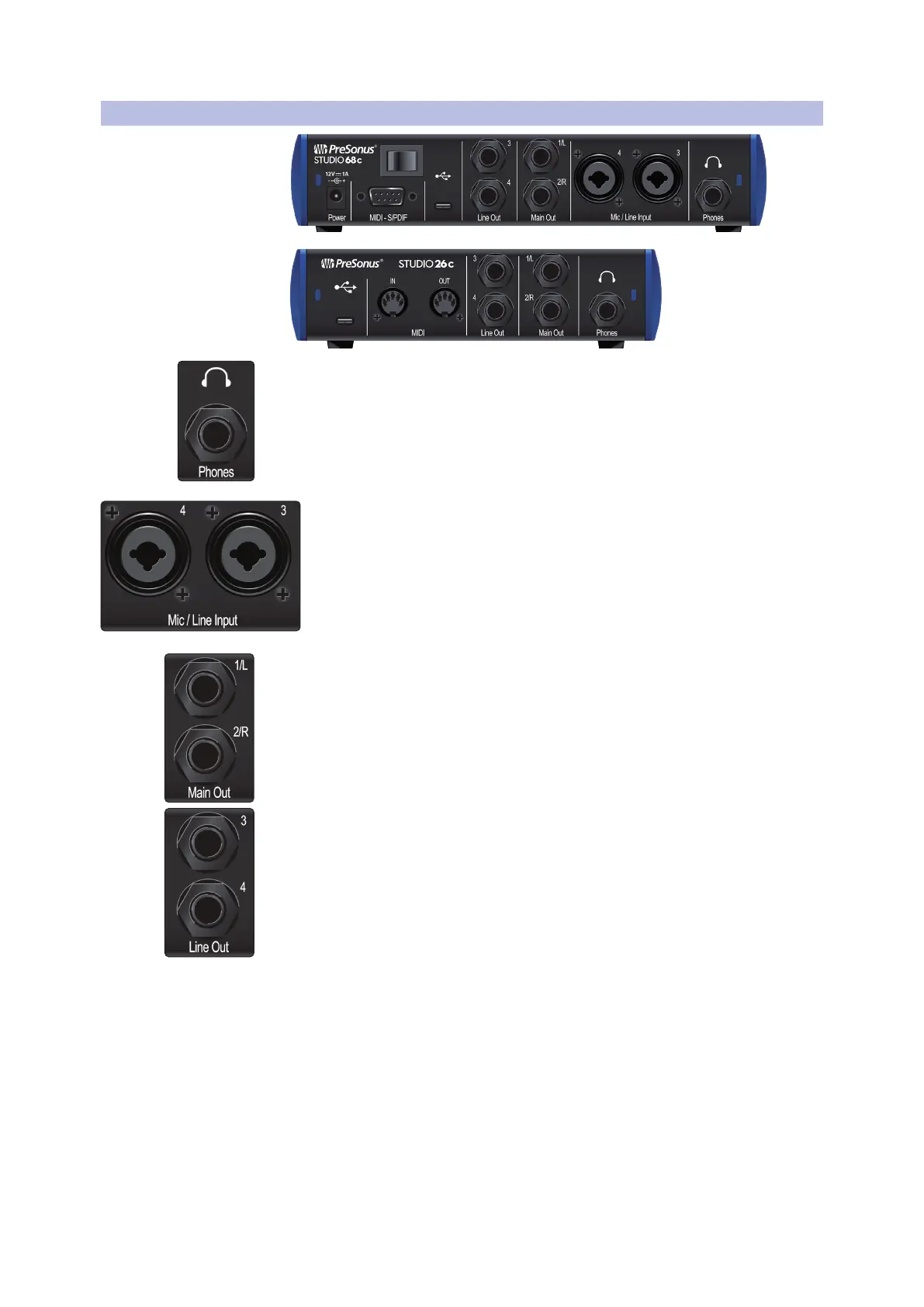 Mic/Line Inputs (Studio 68c). These mic/line combo connectors are for use