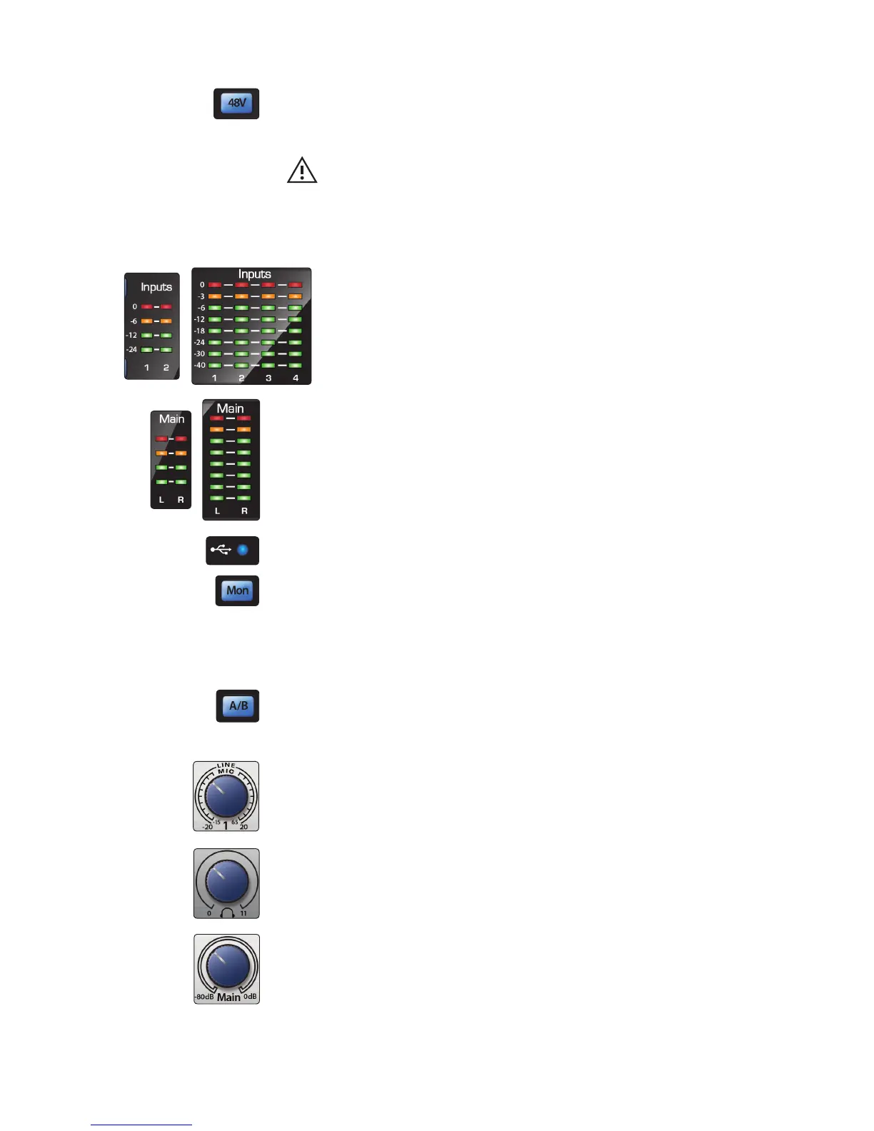 the microphone inputs. Pressing the 48V button switches phantom power on and off