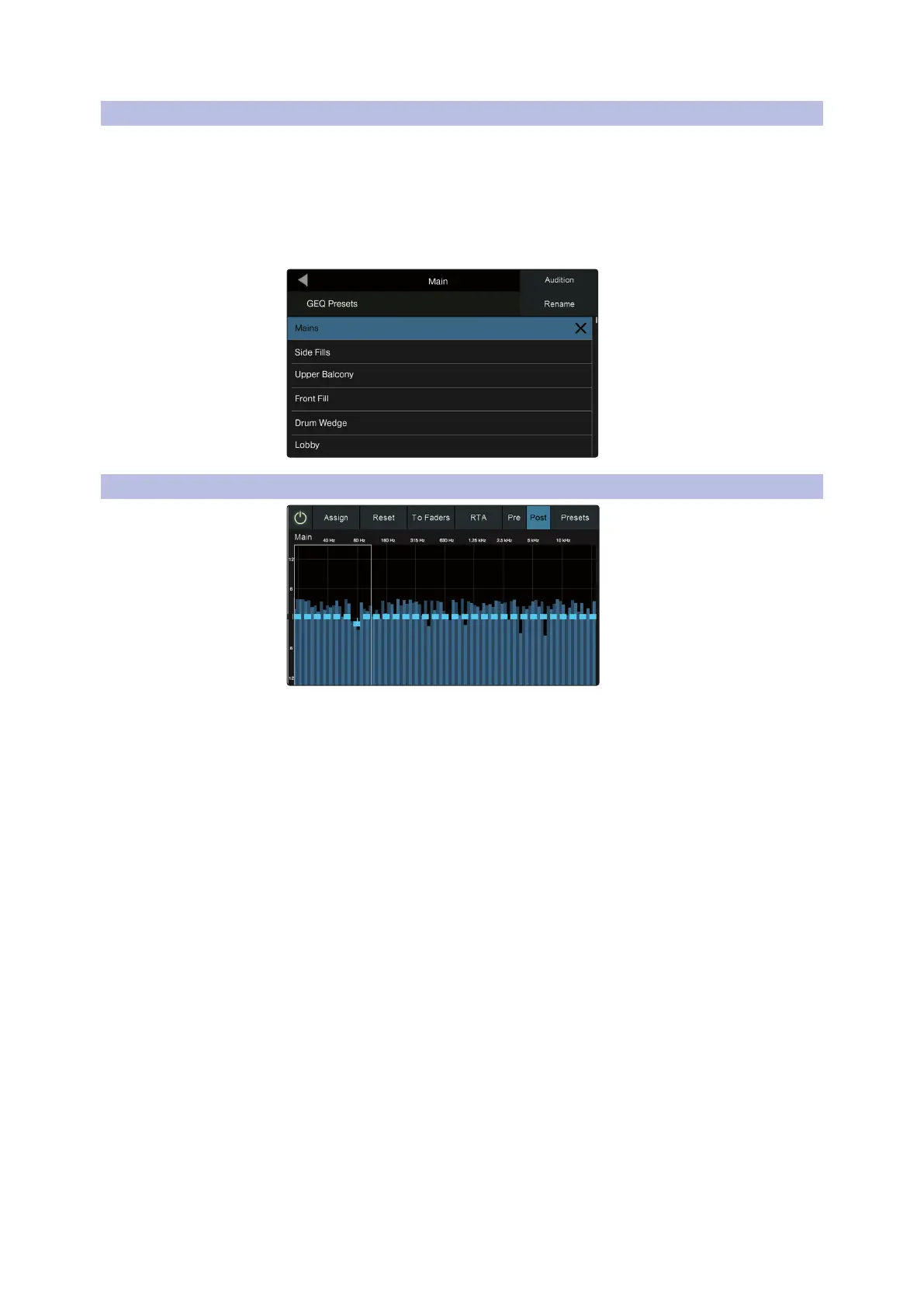 button while the GEQ screen is active. This loads the GEQ Presets screen. In this