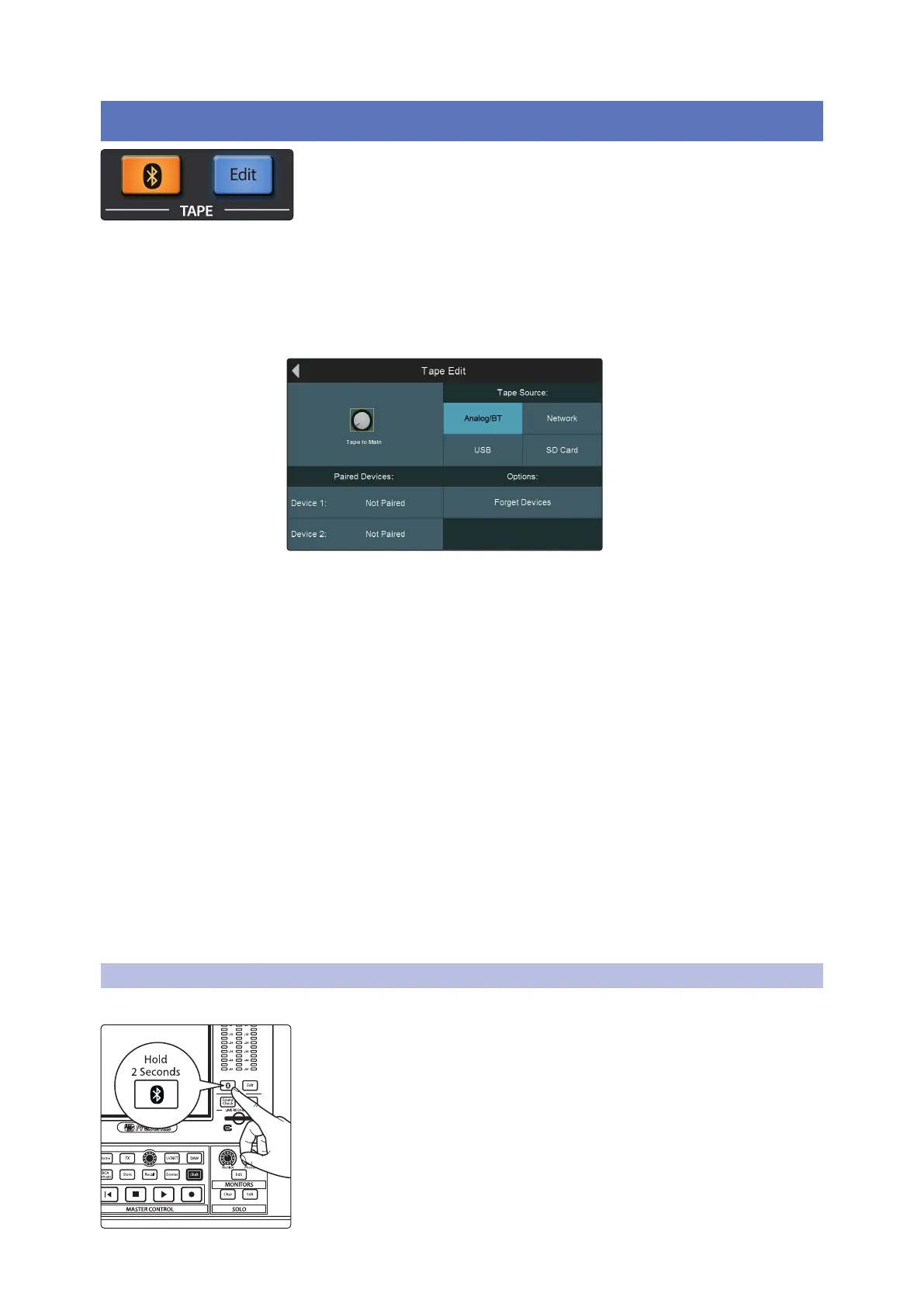• Press and hold the Bluetooth button in the Tape control area for two seconds