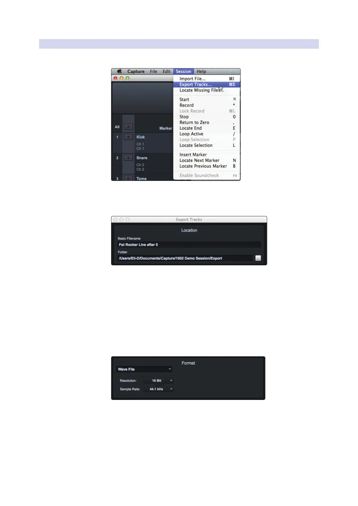 To export audio from your Session in Capture 2, navigate to Session/Export Tracks,