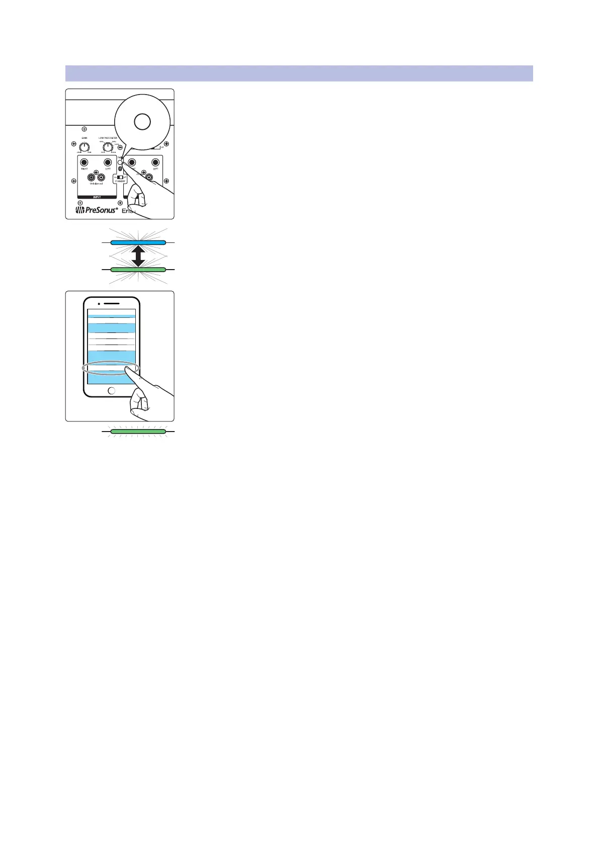The Power/Bluetooth LED on the front of the active speaker will ash blue and green,
