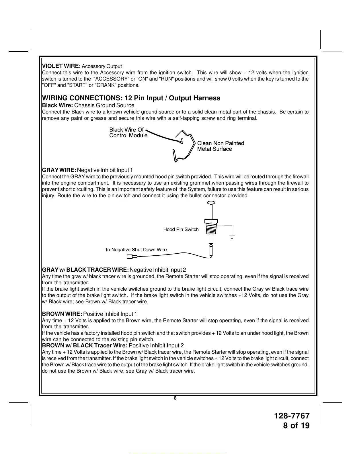Connect the GRAY wire to the previously mounted hood pin switch provided. This wire will be routed through the firewall