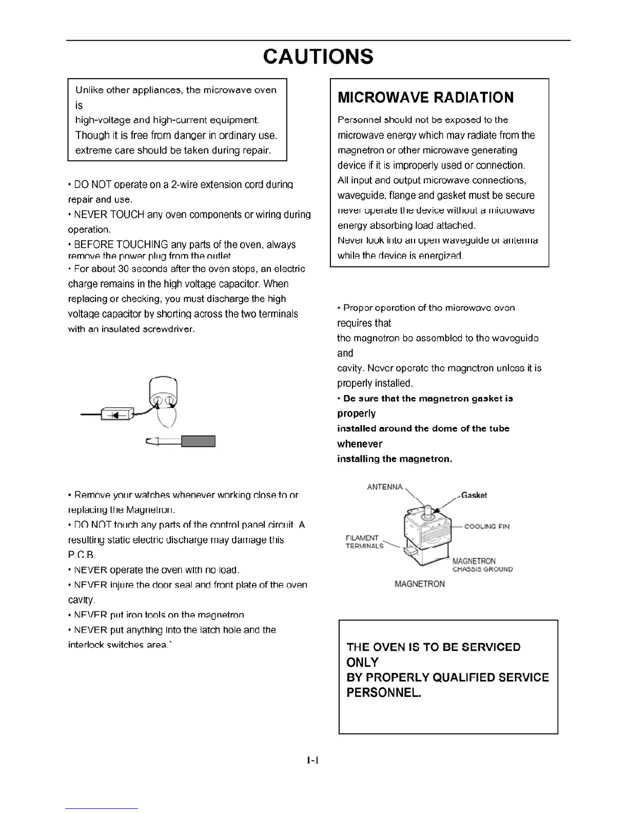 Prestige PR25E - Cautions and Service Safety; General Handling Cautions; Microwave Radiation Safety; Qualified Service Personnel