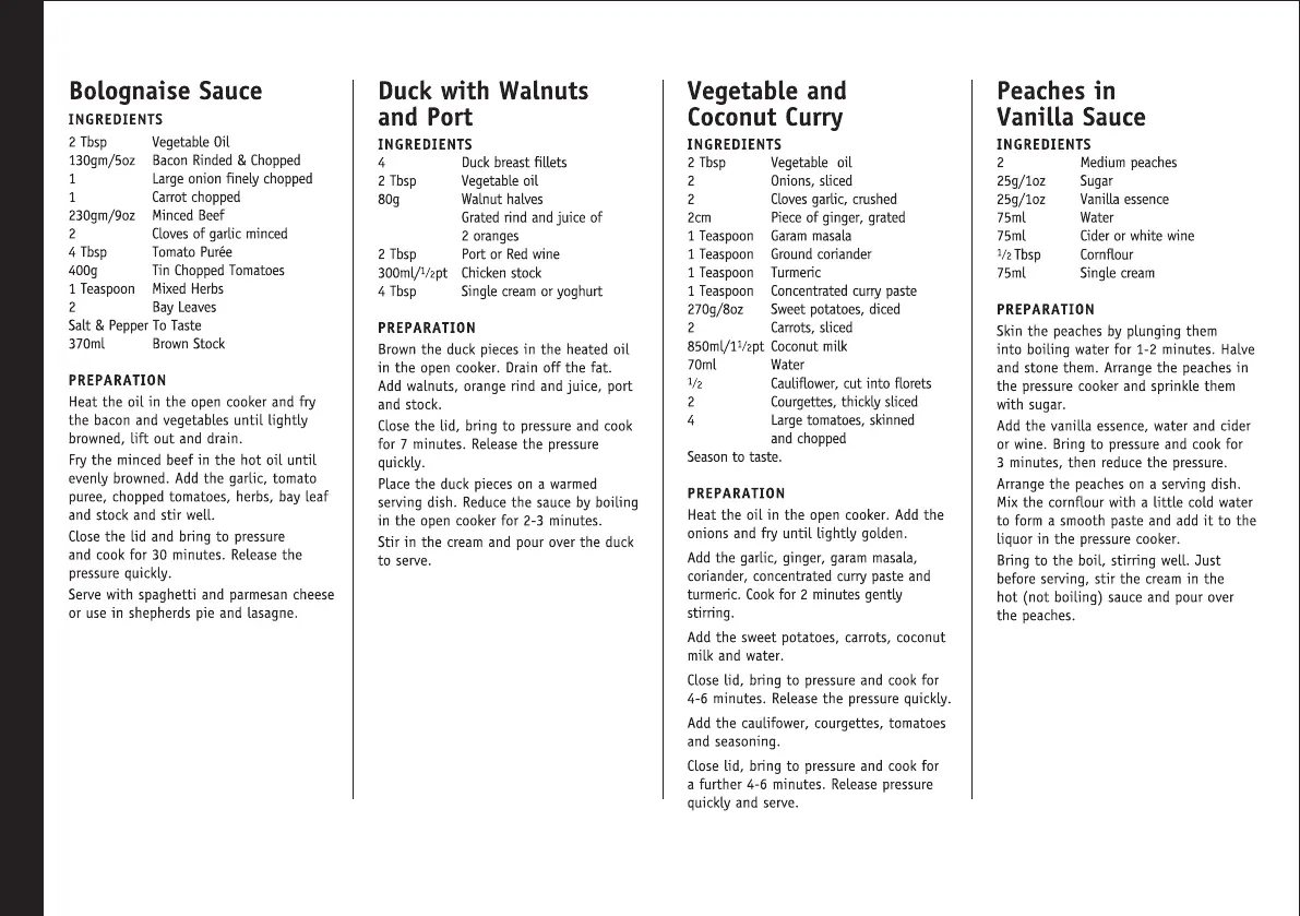 Prestige Quick & Easy - Bolognaise Sauce; Duck with Walnuts and Port; Vegetable and Coconut Curry; Peaches in Vanilla Sauce