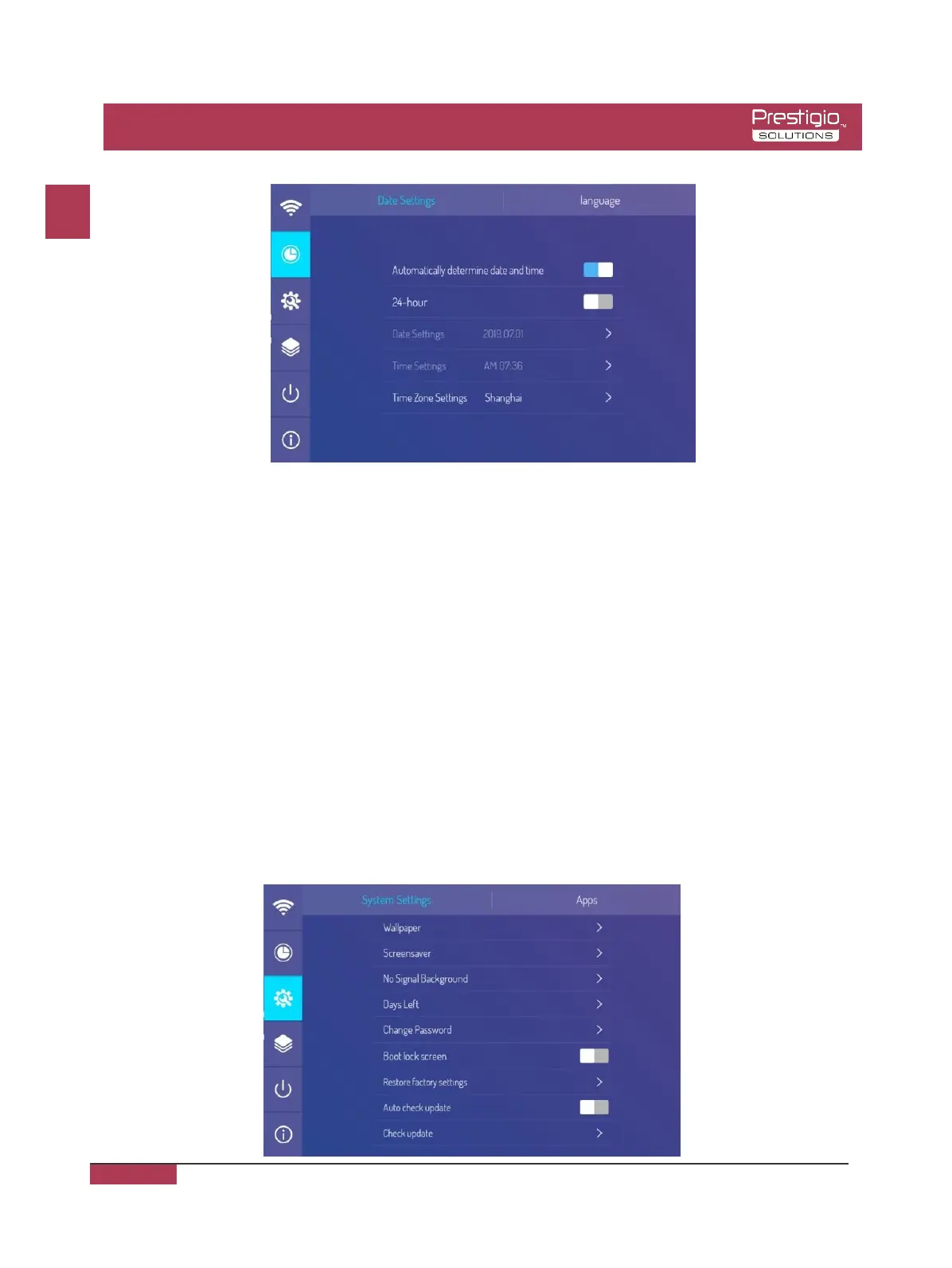 Select sidebar menu, press setting icon and enter system setting page, it can set wallpaper,