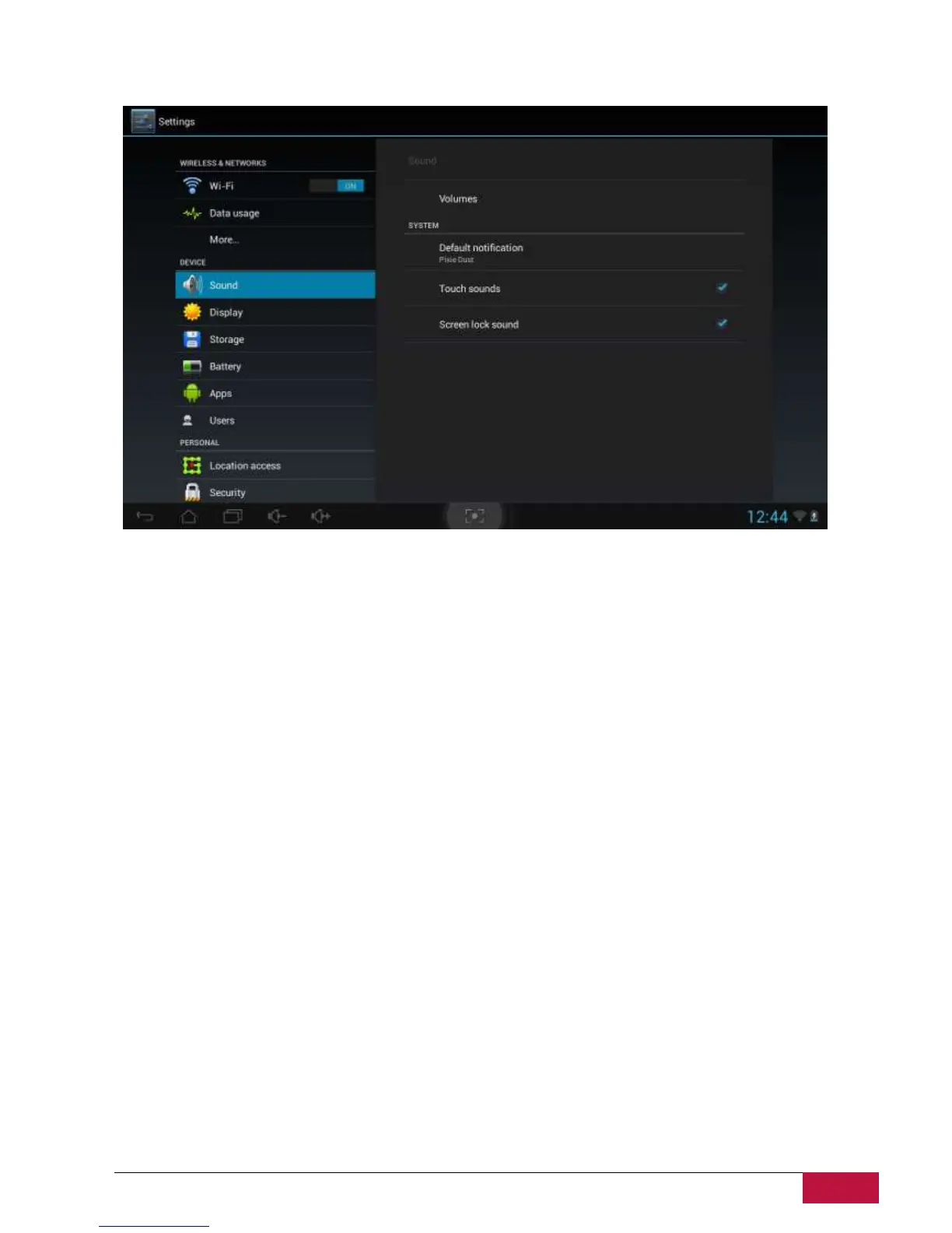 Tap Settings >Devise>Sound >System. Use the checkers to enable/disable Touch sounds or screen lock