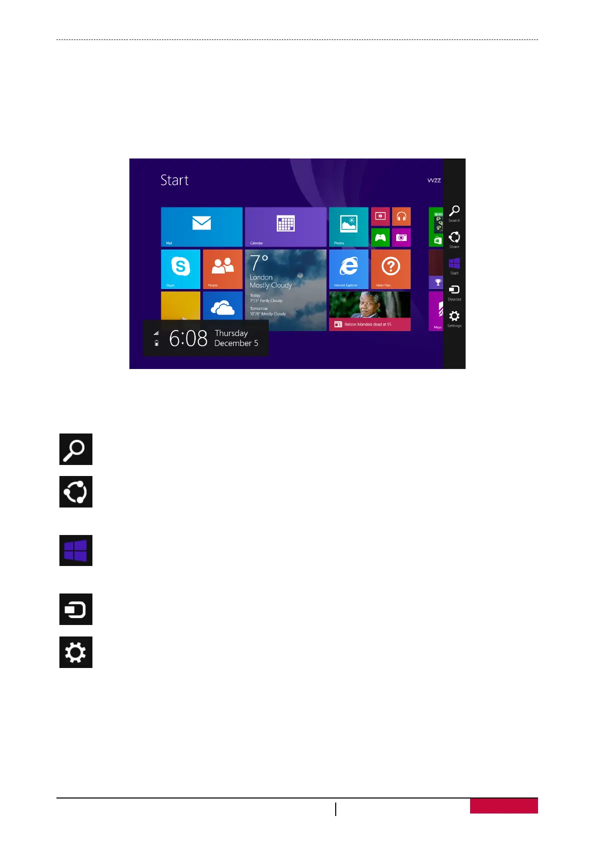 •Here is how to open the charms: Swipe in from the right edge, and then tap the one you want.
