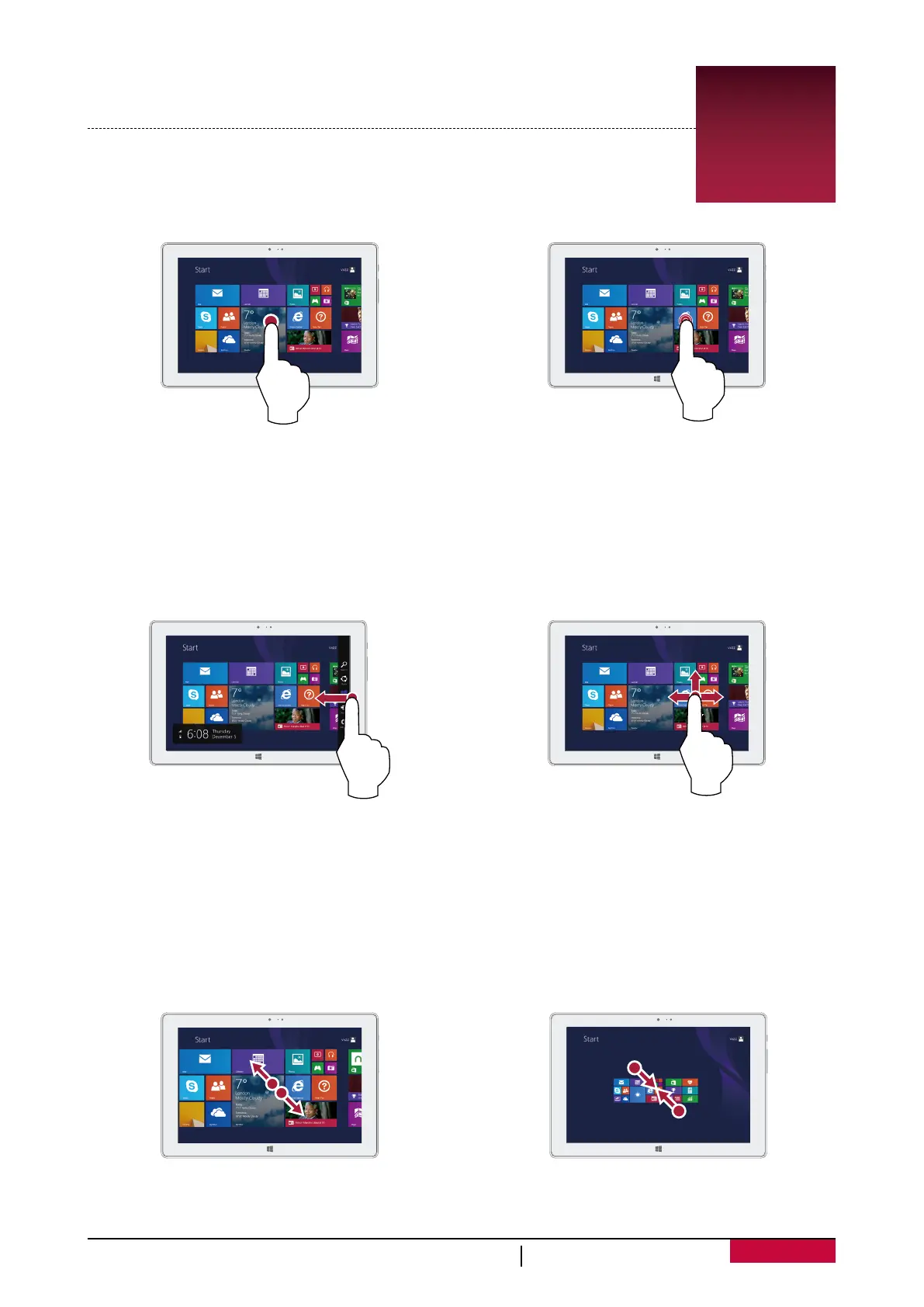 •Left edge: brings in open apps, snaps apps,