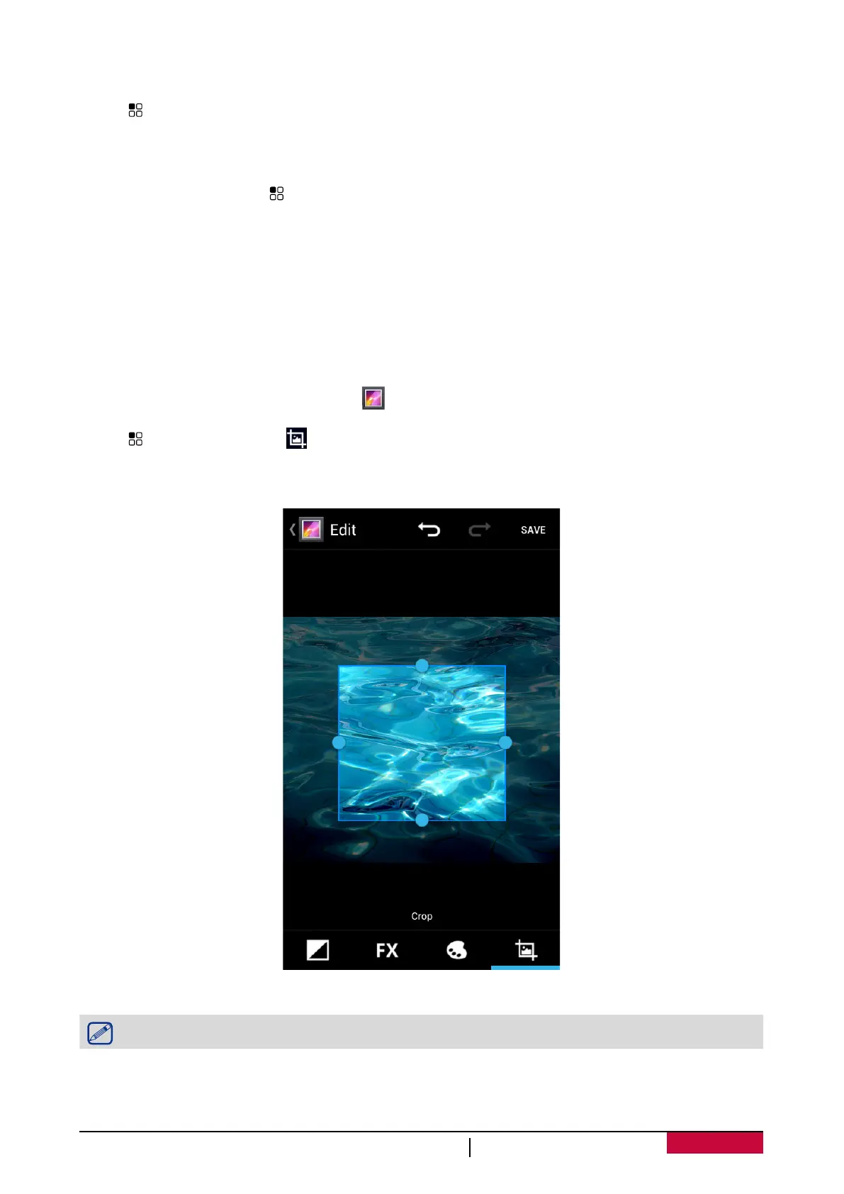 •Crop: Resize the orange frame to crop and save the photo in it.