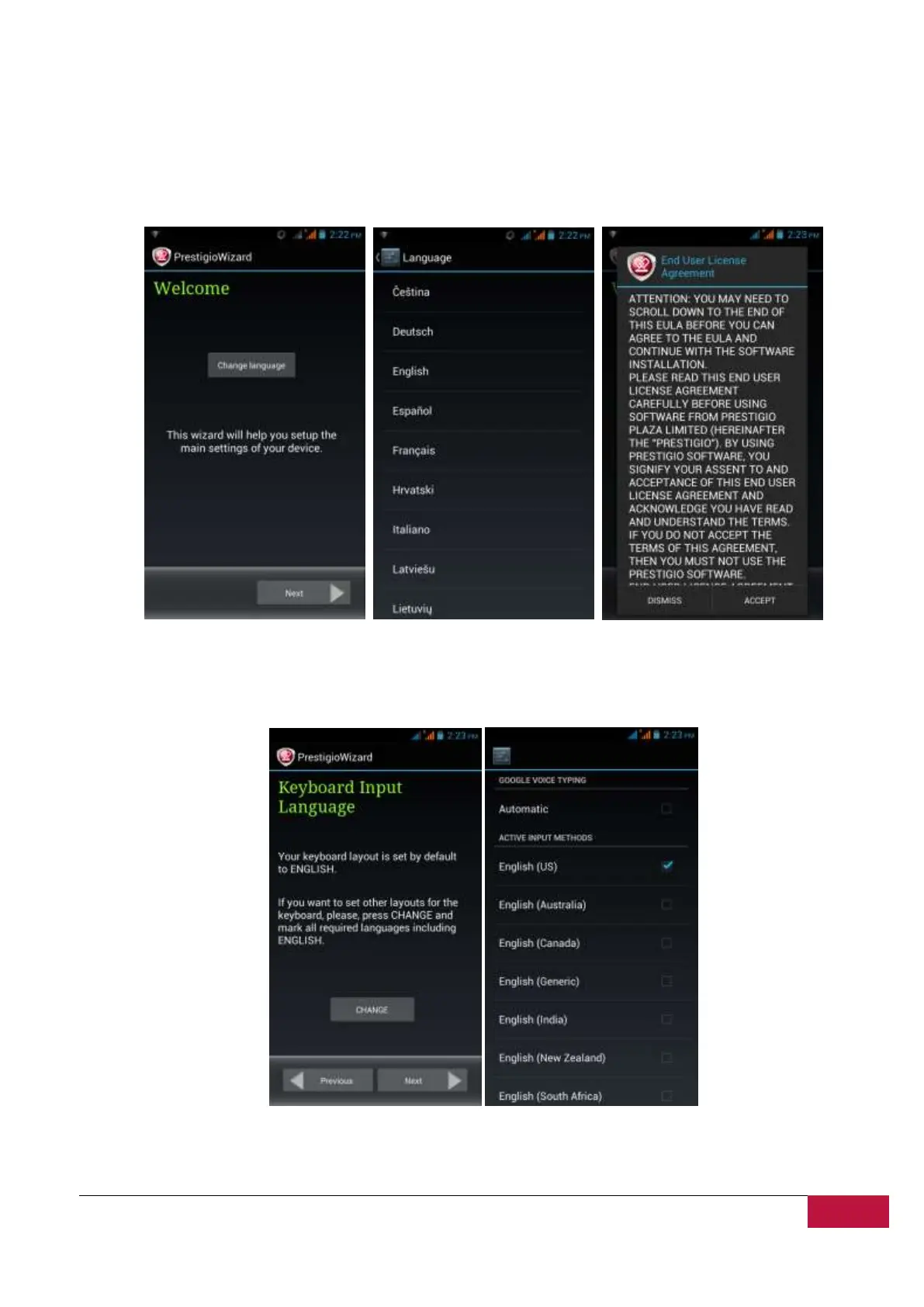 system of Prestigio MultiPhone. Tap “Change language” button to access a list of available languages.