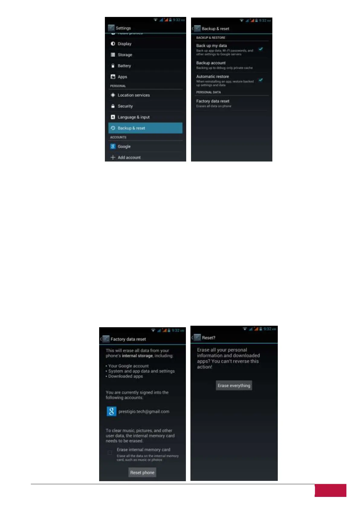 Factory data reset. Touch this option, then Reset phone to erase all your personal data from internal