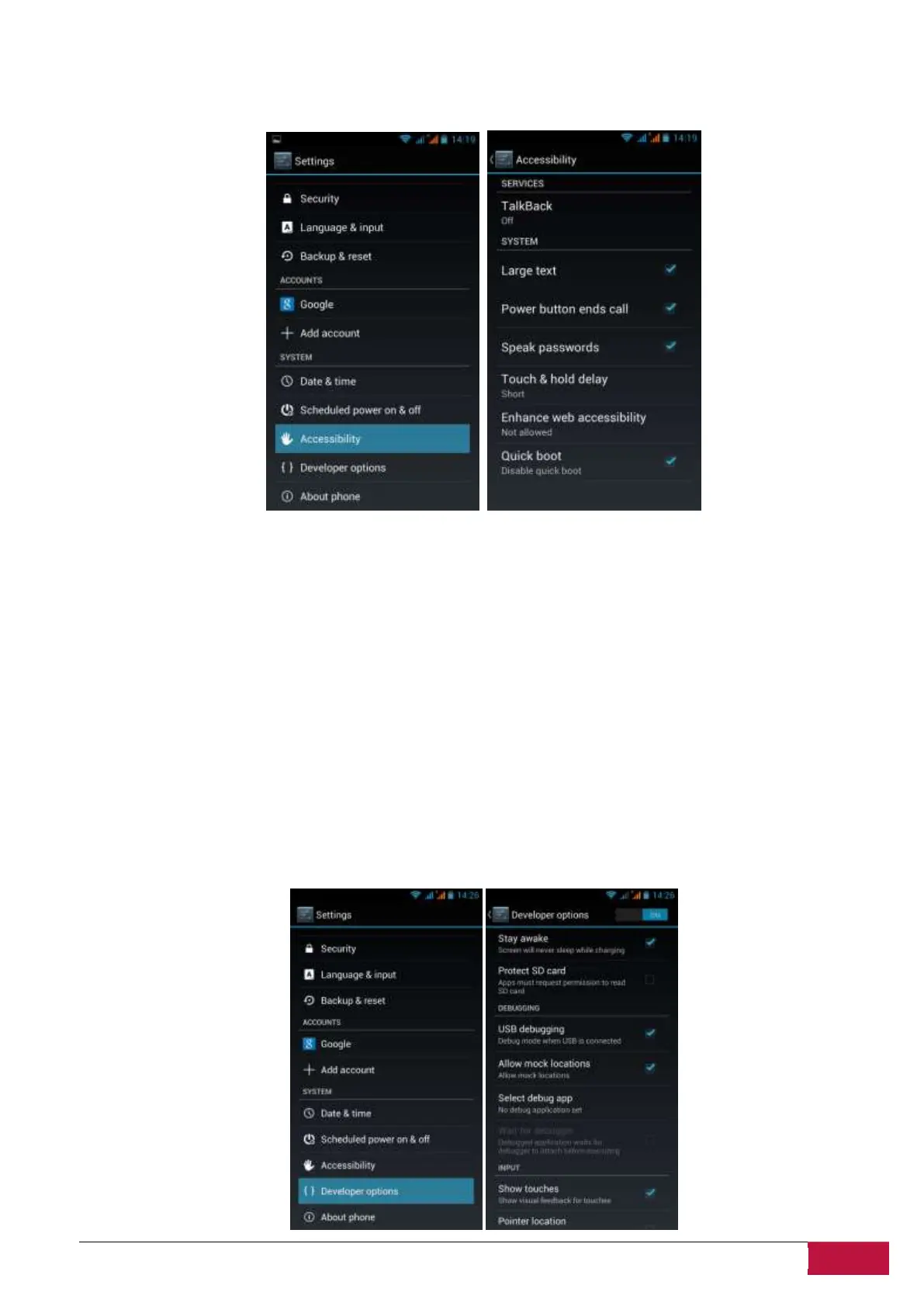 You can set the USB debugging mode, select screen stay awake while charging and so on. You can also