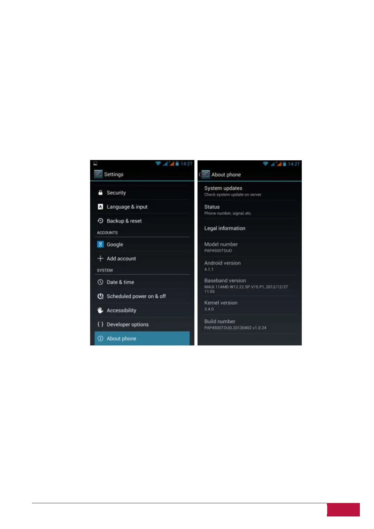 check the battery use of individual applications or view the legal information and firmware version (Build