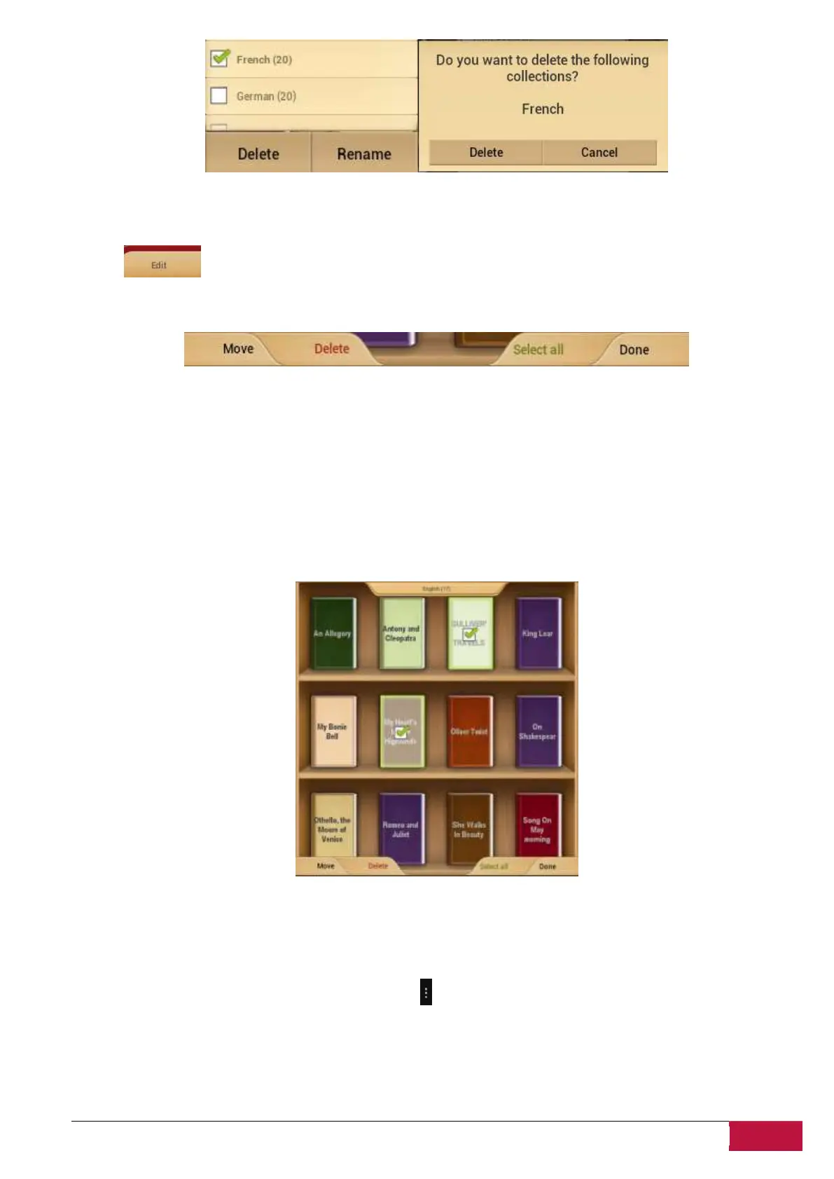 Delete - Remove all selected books from the application and device.
