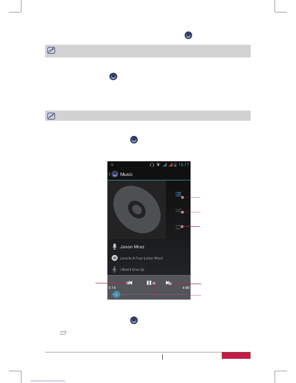 - To use the music player, on the home screen or list menu, tap .