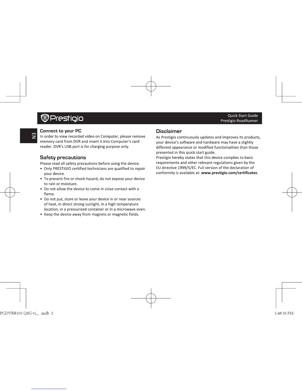 Prestigio RoadRunner 505 - Connect to your PC; Safety precautions; Disclaimer