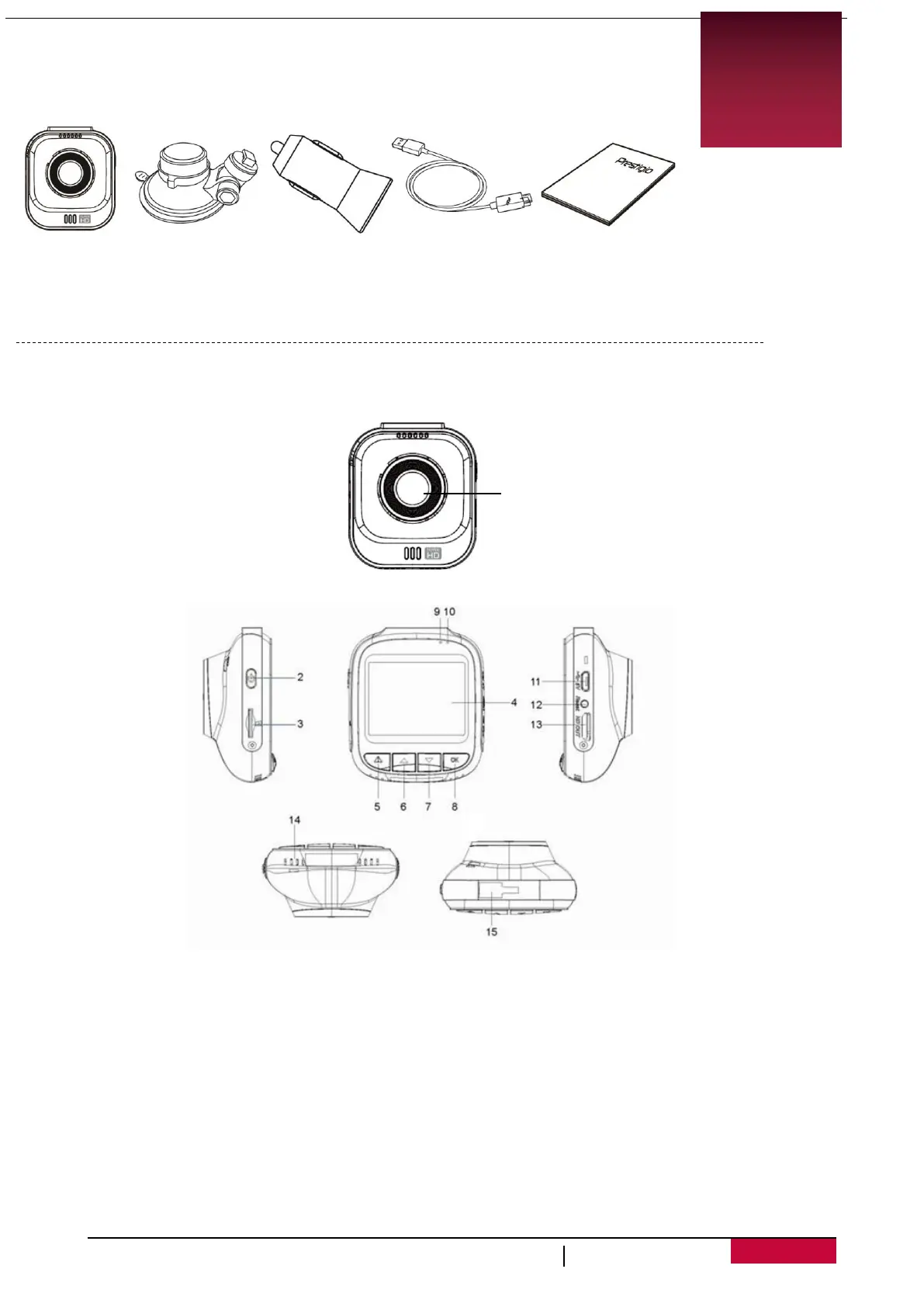 • Car video recorder • Car charger • Quick start guide