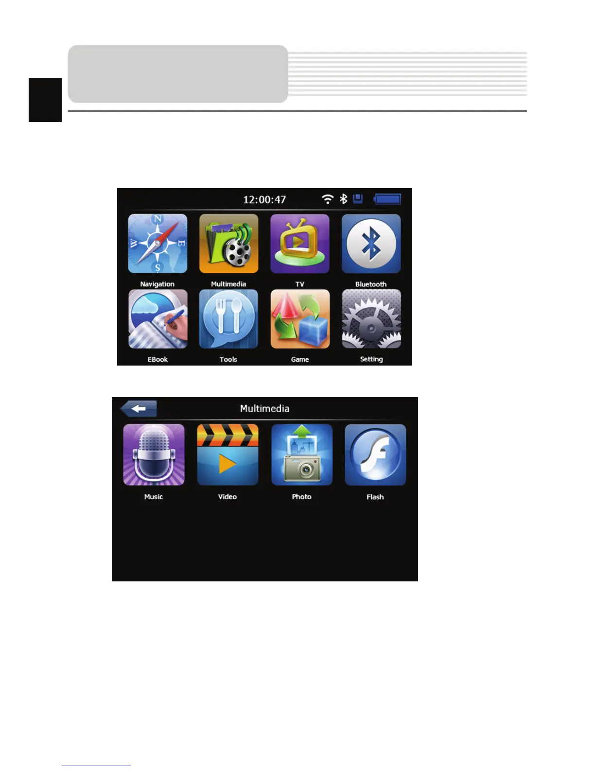 The main menu consists of the following sections: Navigation, Multimedia, Analog TV,