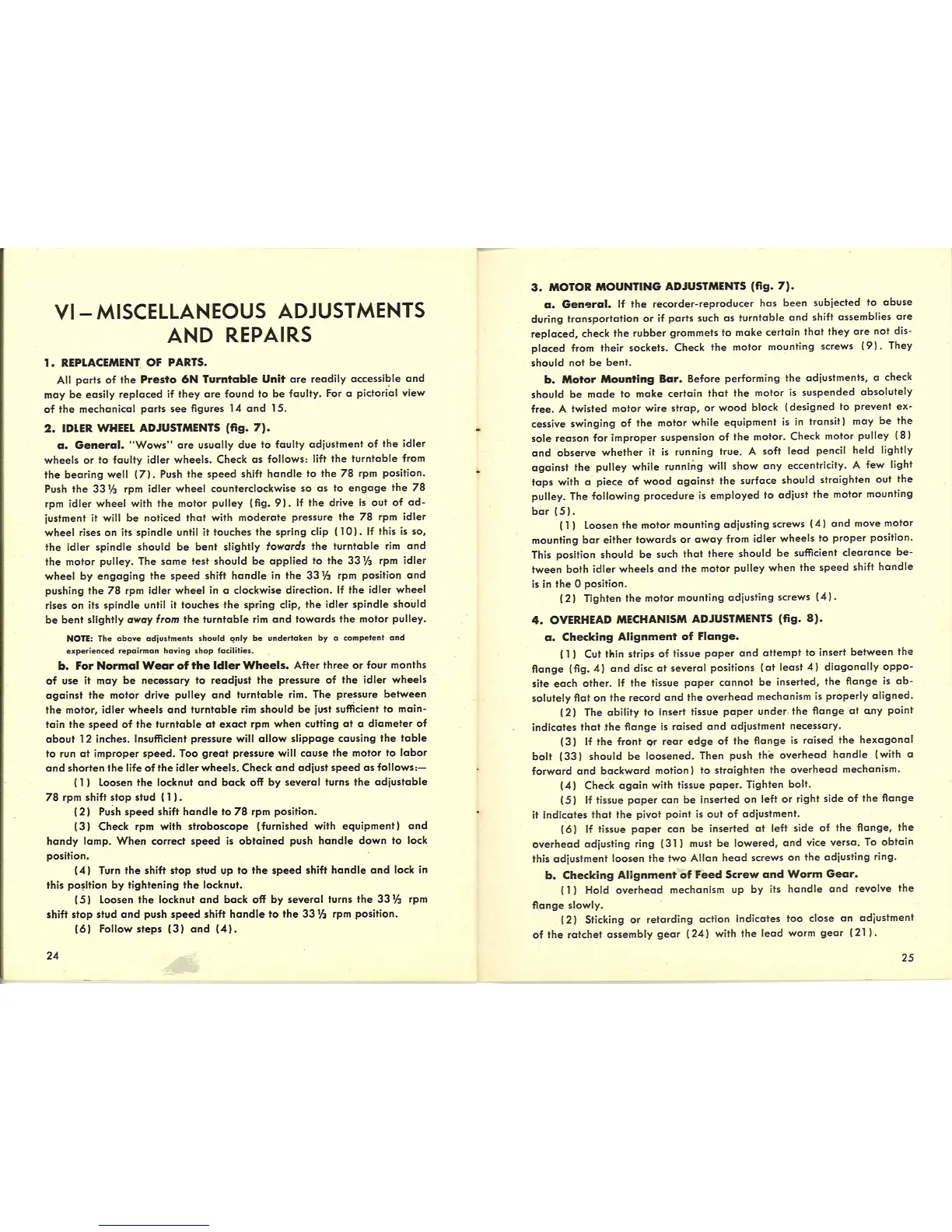 Presto 6N - Adjustments and Repair; Idler Wheel Adjustment; Motor Mounting Adjustments; Overhead Mechanism Adjustments
