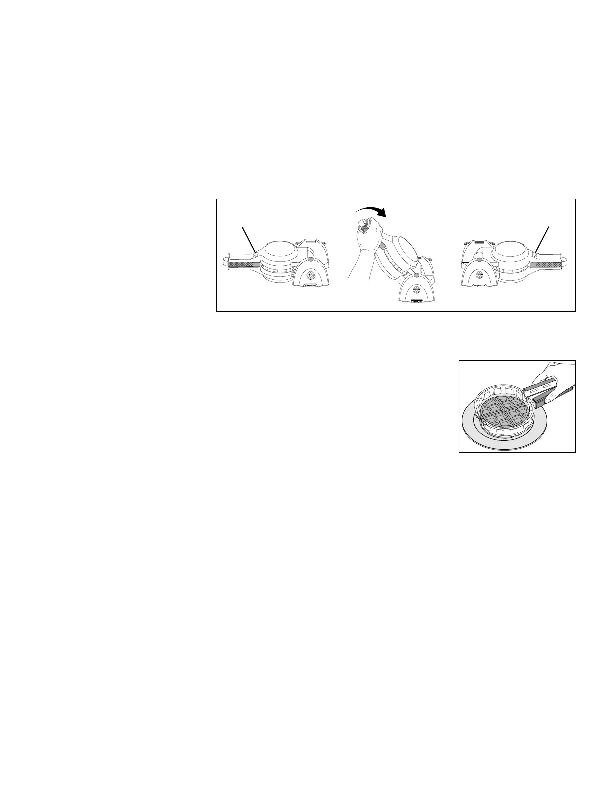 8. Close the wafe maker (Fig. D). Immediately grasp the handles and ip the unit over 180° (Fig. E and Fig. F). This allows