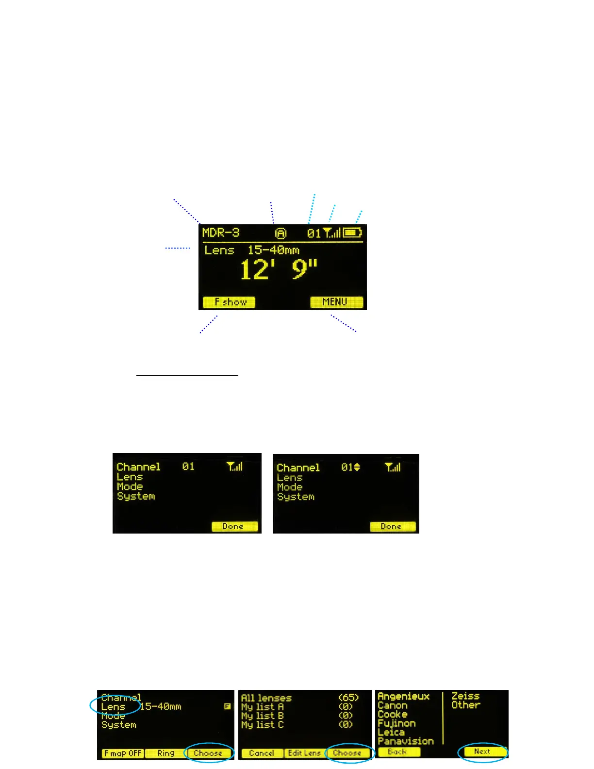 4. Selecting Lens with the Nav key (Fig. 6.1) allows lenses to be calibrated and their data