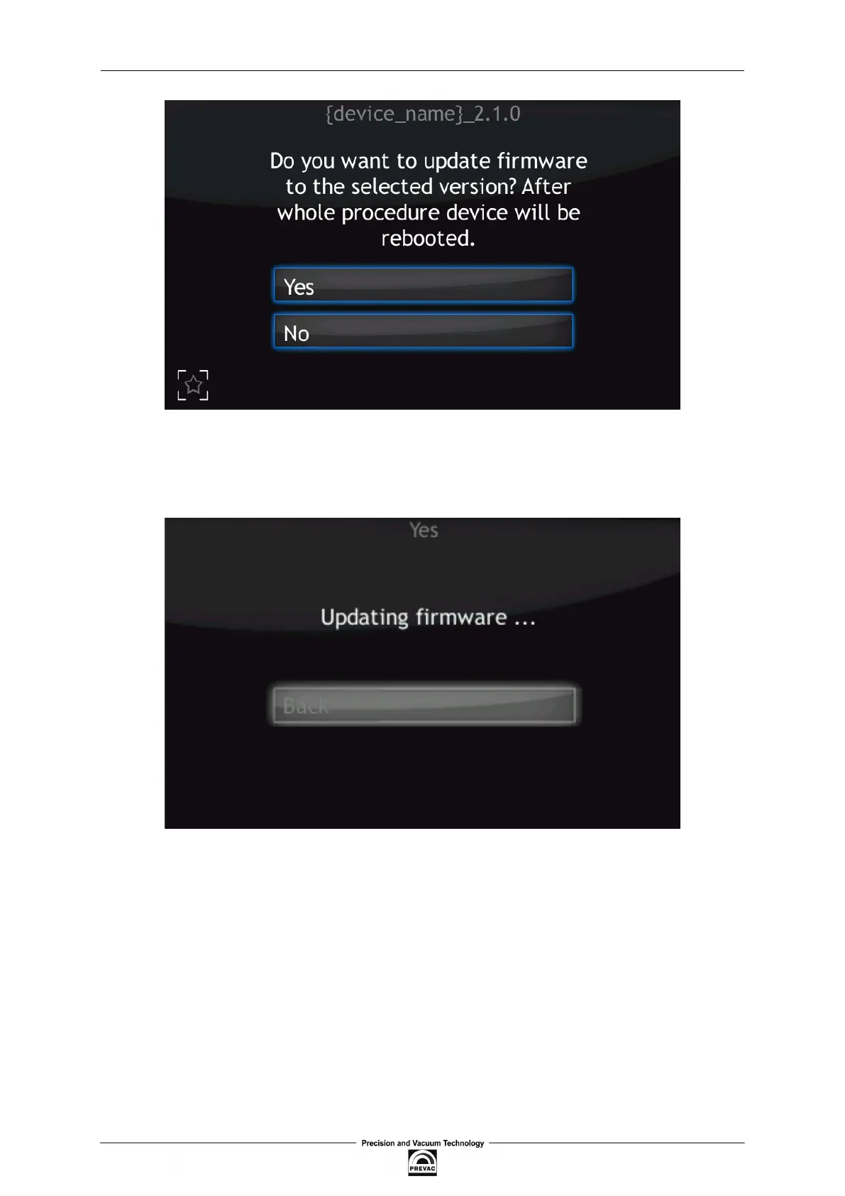 After selecting to proceed with the update, the device will stop and the updating procedure will be