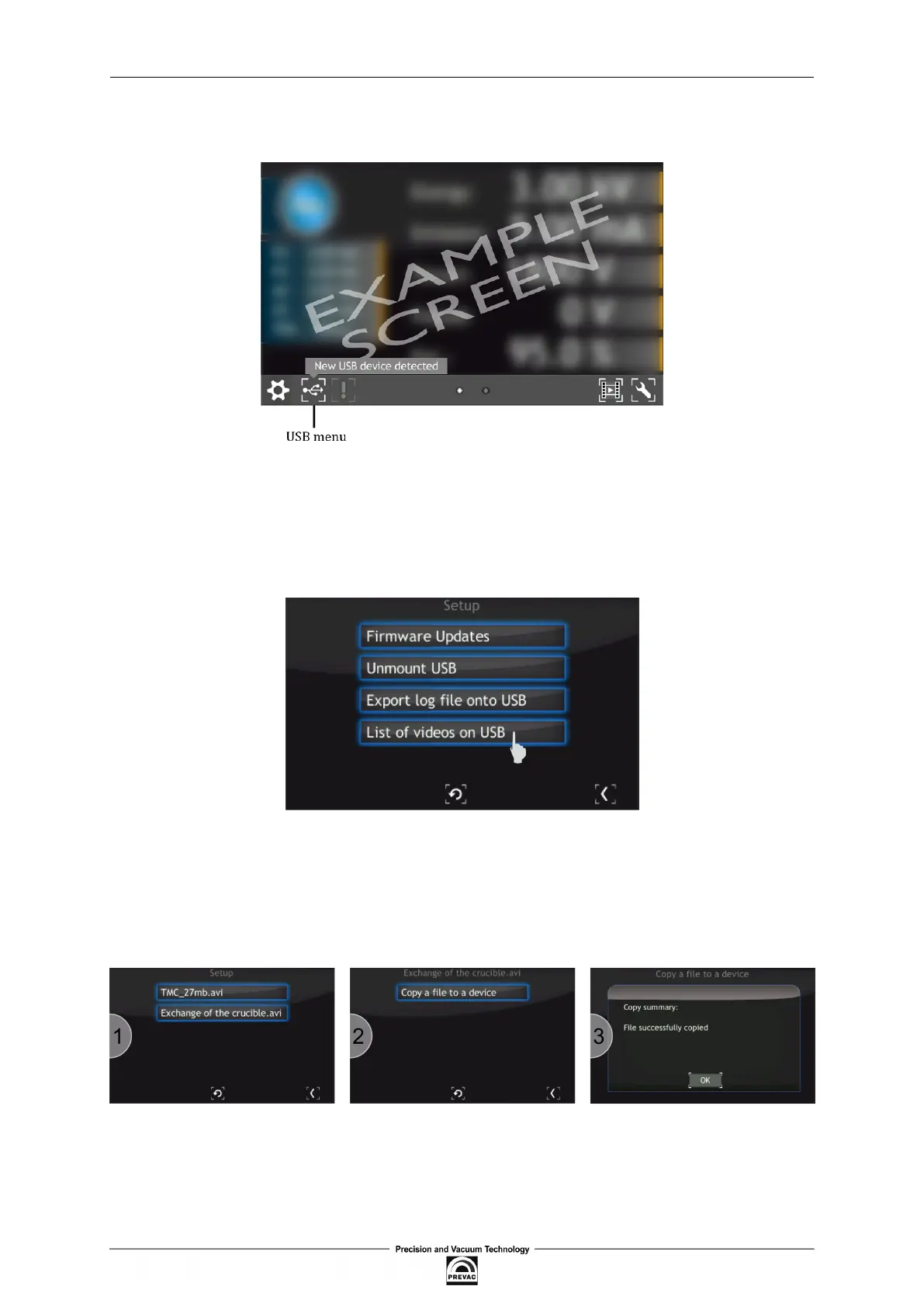 Prevac MG15 - Noti Ication about Detecting USB; USB Menu - List of Videos on USB; Copy *.Avi to Device