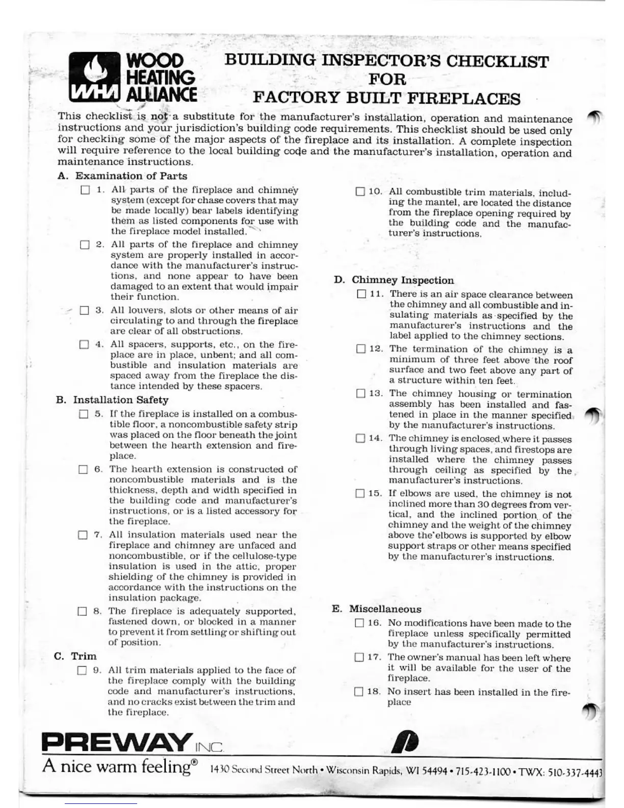 Preway BE41 - Building Inspectors Fireplace Checklist; Installation Compliance Checklist