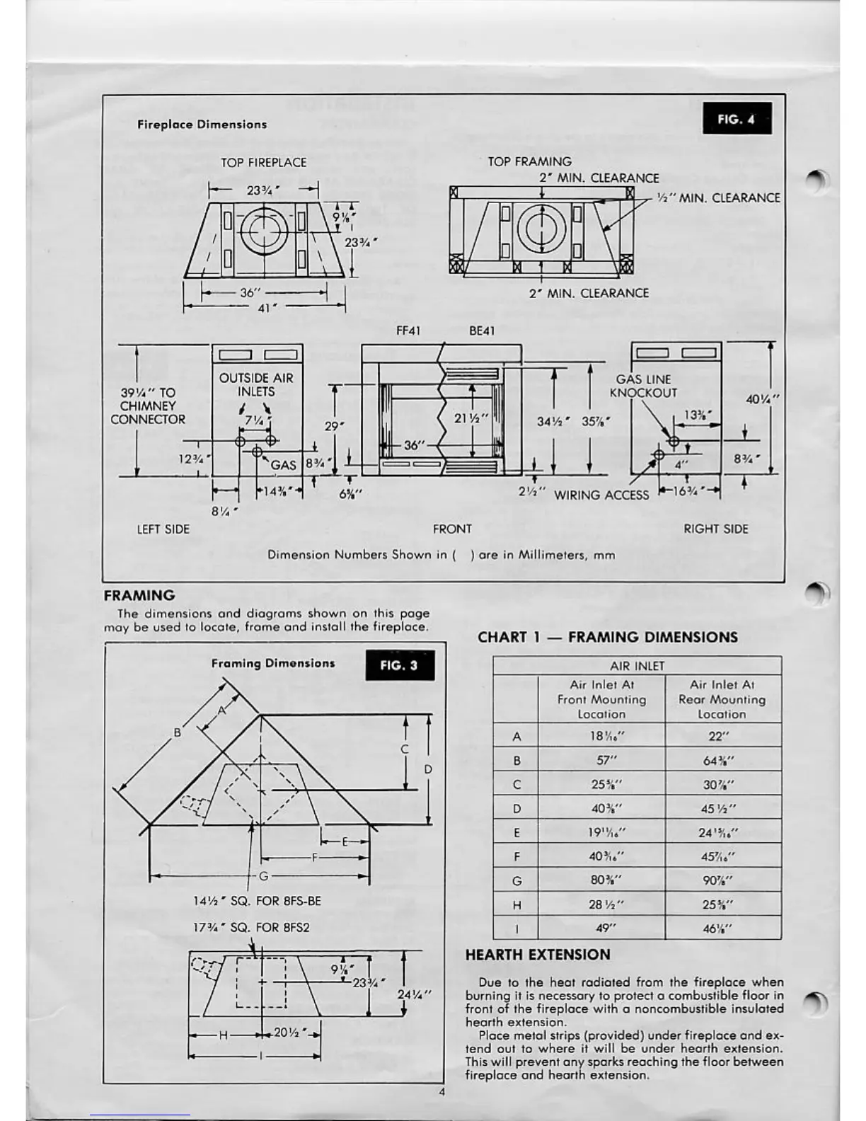 Preway BE41 - Fireplace and Framing Dimensions; Fireplace Unit Dimensions and Diagrams; Framing Layout and Hearth Extension