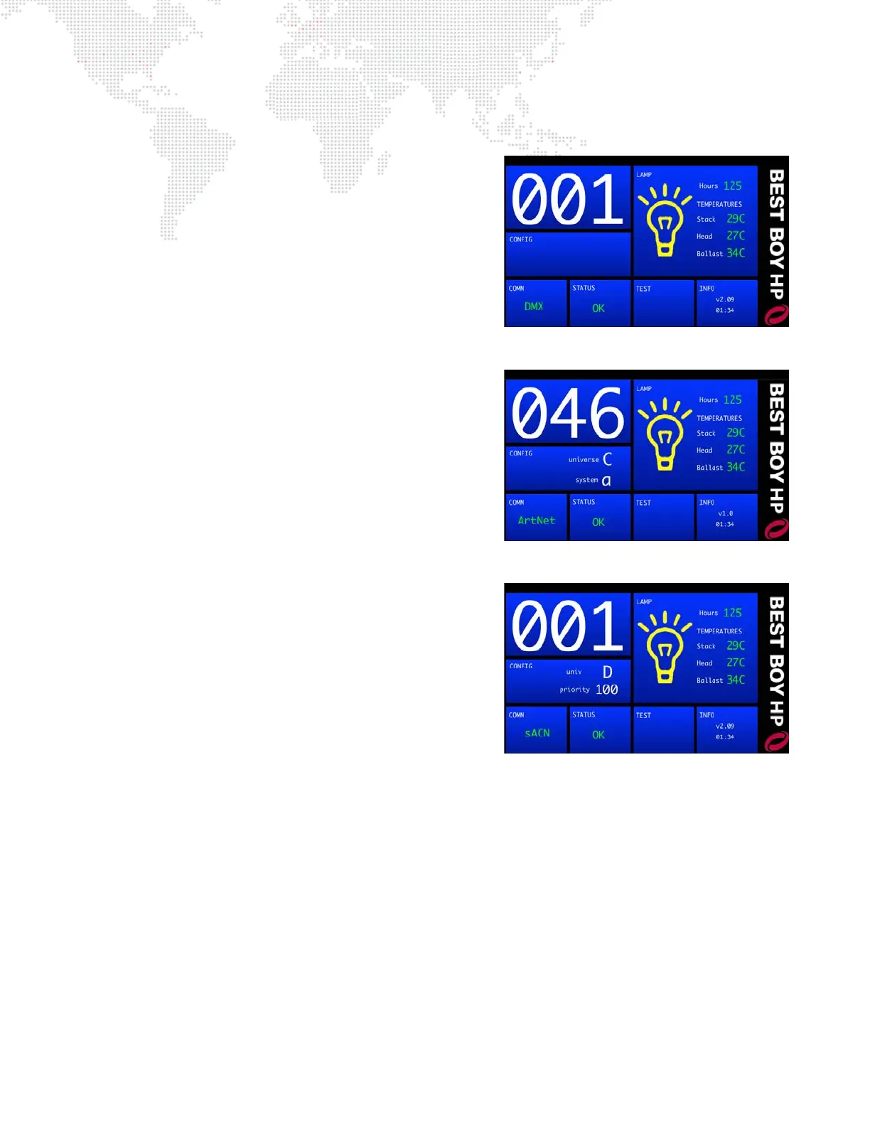 + Status - displays fixture status: CAL (yellow), OK (green), or ERR (red).