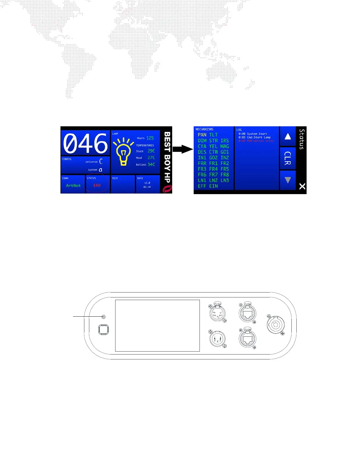 The Status screen will indicate which specific mechanisms, if any, have errors. It also provides a log of systems