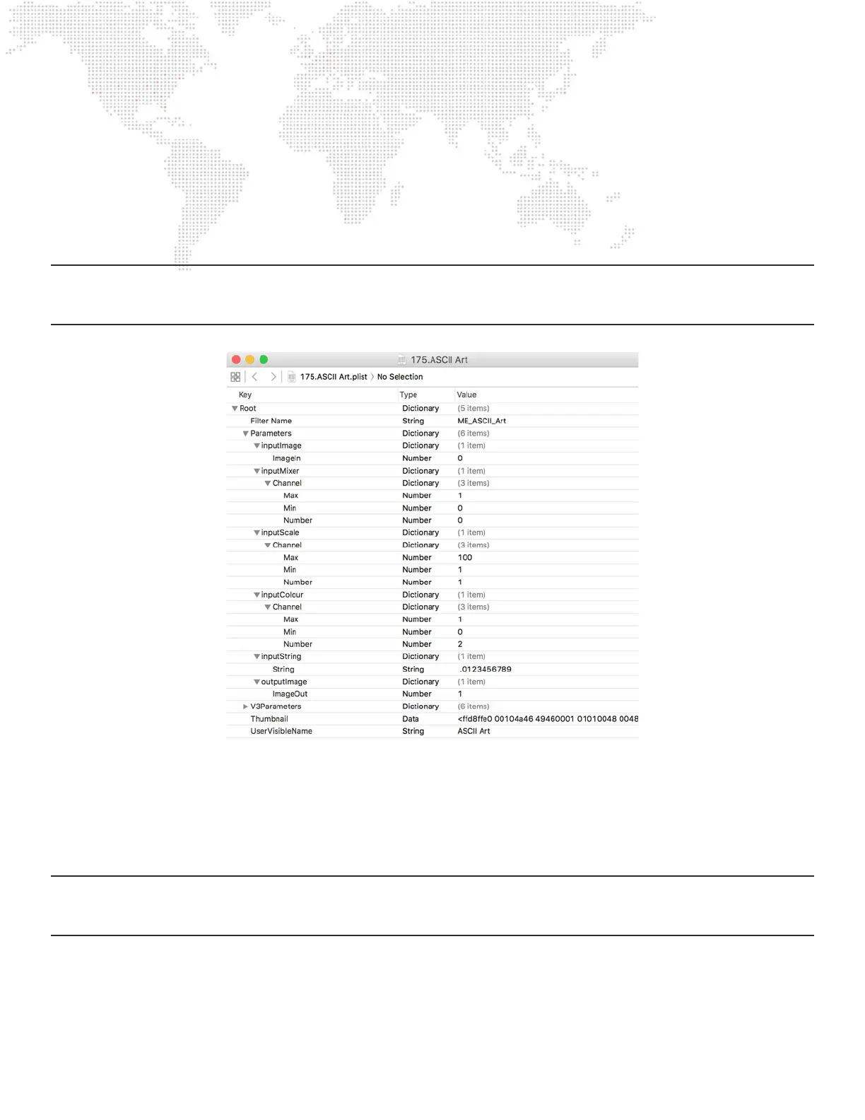 For the ASCII Art effect, the value that needs to be edited is the “inputString” dictionary’s “String” value. The default
