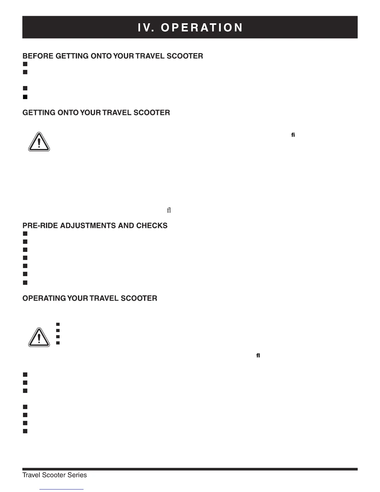WARNING! Never attempt to get onto or off of your Travel Scooter without rst removing the