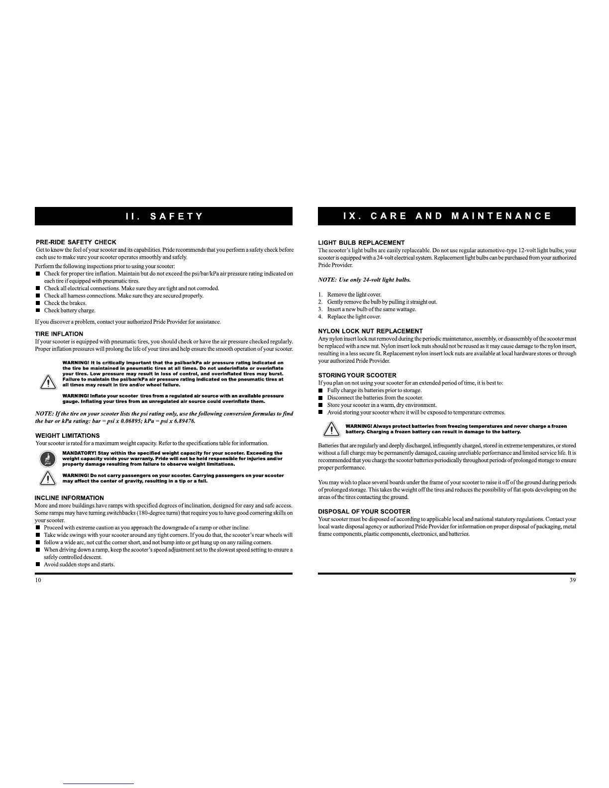 Pride Mobility Apex Sprint - Care and Maintenance; Tire Inflation; Weight Limitations; Incline Information
