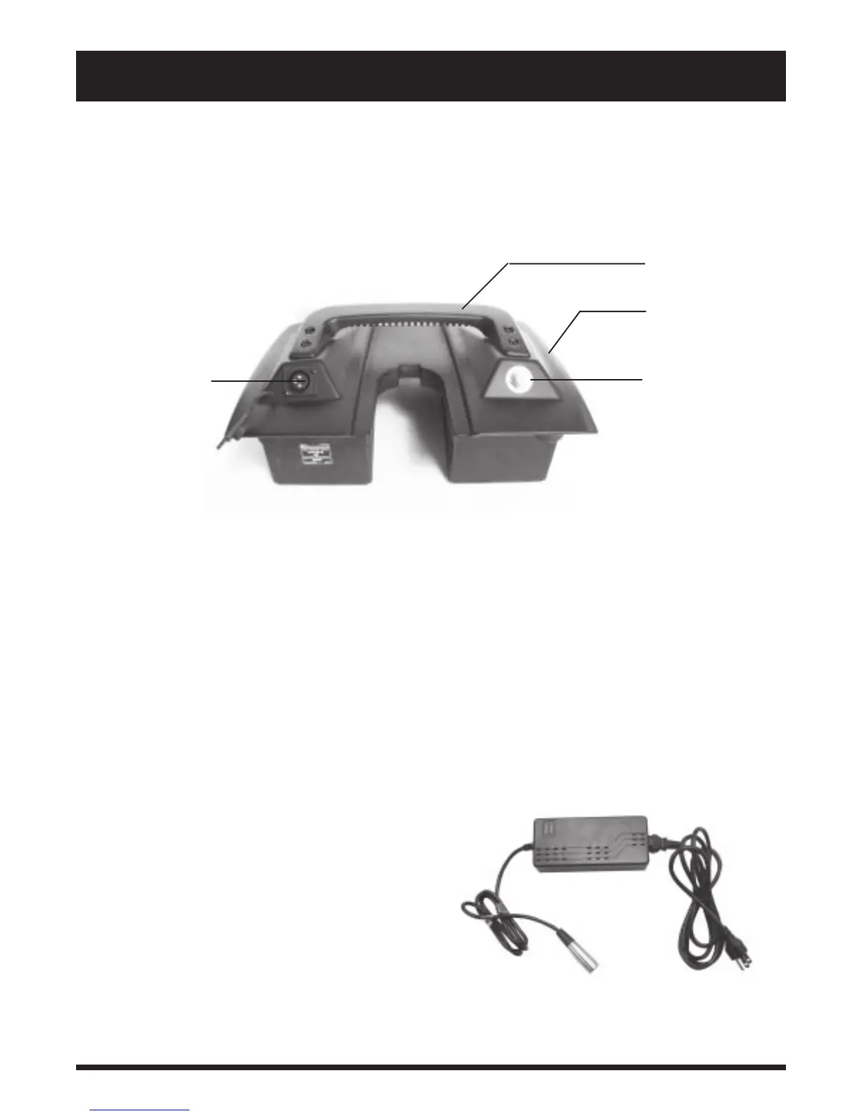 AH batteries; the charger power cord receptacle; and the main circuit breaker (reset button). A handle on the top