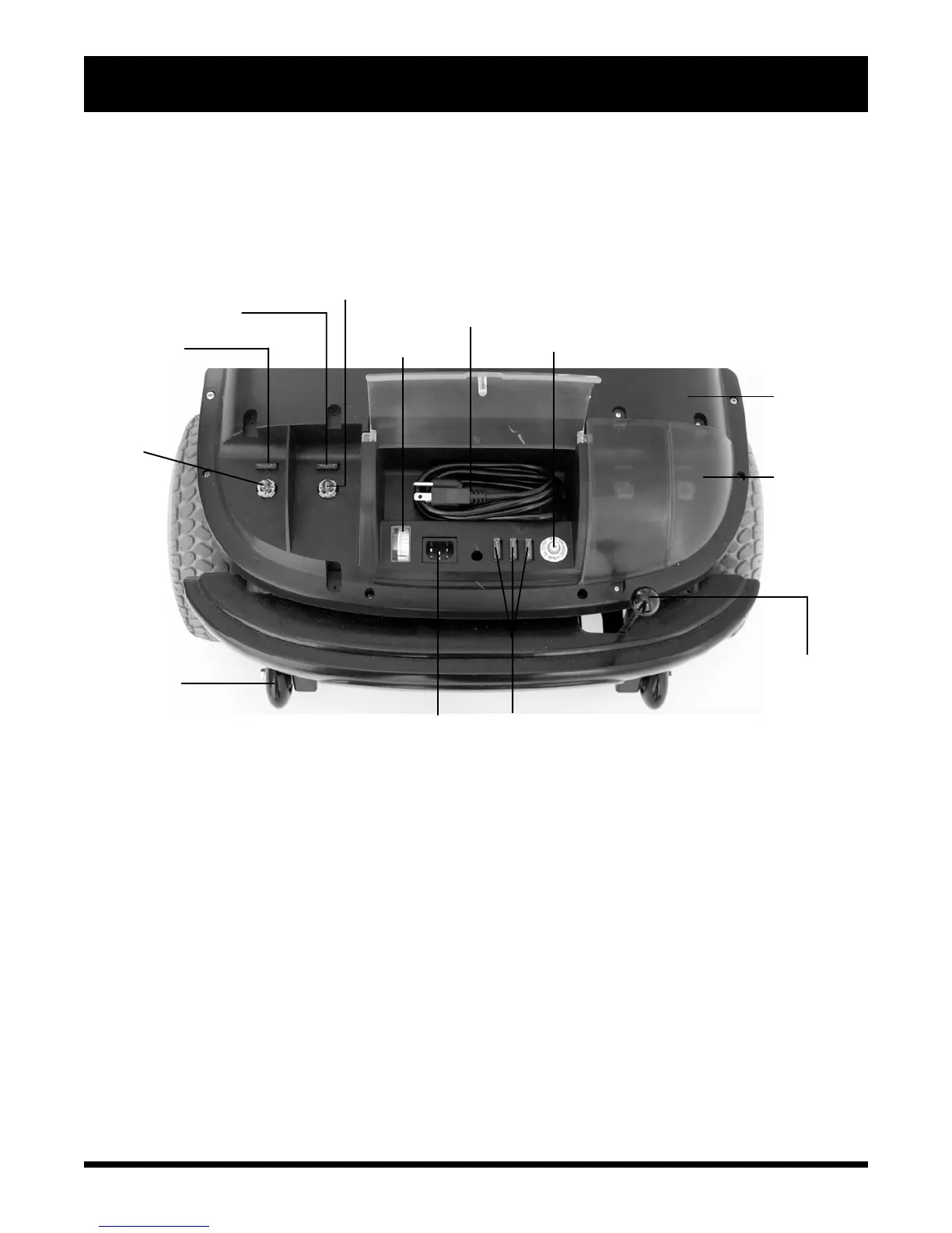 The onboard battery charger (not shown), the charger power cord receptacle, the batteries (not shown), the