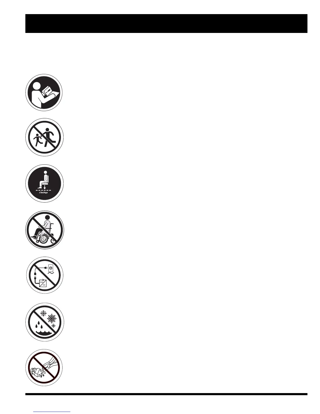 The symbols below are used on the power chair to identify warnings, mandatory actions and prohibited actions.